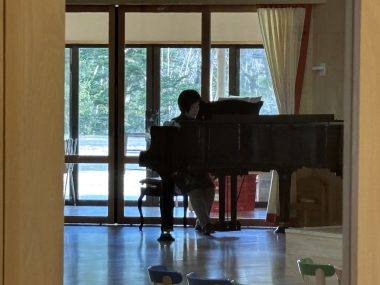 修了礼拝の朝、いつものように玄関の掃き掃除をしていると、広場から今日、礼拝で奏楽を担当してくださる2歳児りんご組のA先生がピアノを練習する音が聞こえてきました。あえて明かりをつけずにいたのか、つけるのを忘れていたのか、薄 …