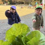 クマの誘引材料にならないように収穫した渋柿を保護者の皆さんにもお持ち帰りしていただき、試しにバケツ栽培をするために白菜を移植してから2週間が過ぎました。嬉しいことに白菜は枯れることなく結球し始め、5歳児ひかり組のT君が2 …2025.11.14