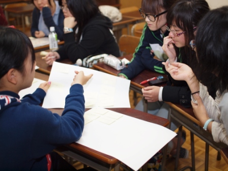 KJ法と呼ばれる手法で考えをまとめる議論の様子