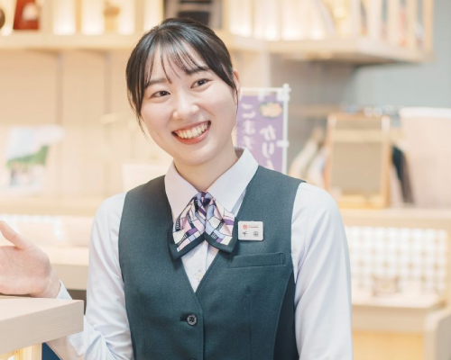 自分のやりたいことに挑戦できる環境が整っていると思い、宮城学院女子大学へ進学しました。学生時代は地方創生に向けた商品開発や学術大会に挑戦し、成果を上げることに力を注ぎました。また、大勢の前でのプレゼンテーションの経験が、聴きやすい話し方を意識するきっかけとなり、接客販売にも役立っています。現在は東北の伝統工芸品を扱う売り場で接客販売をしています。多種多様な商品に触れる中で新しい発見があり楽しいです。お客様に商品の魅力が伝わり、「楽しい買い物だった」といった言葉をいただけた時にやりがいを感じます。地域発展に貢献したいと強く思っているので、今後も地域企業と連携し、地城性のある商品の開発に取り組みたいです。