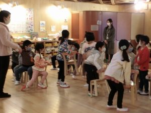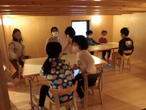 そら組もお集まりをした後に好きな遊びが始まっていました。前回のフリー参観よりもまとまりを感じられたとの感想が寄せられました。参観の保護者に寄ってくるのではなく、子ども達だけの関わりがあり、「親の方が『見せて。』と言ってから傍にいました。」との感想もありました。