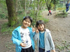 「えんちょうせんせい、こっちもみて」と誘われて、地下一階(野外炊飯場)に行って見ると、テーブルの上でお店屋さんごっこをしていました。「本当に食べたくなっちゃうね。」と話すと「どうぞ」と砂のデザートを頂きました。楽しそうな品物はあっという間になくなってしまいました。