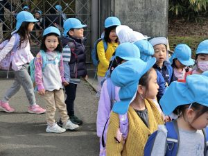 はじめての地下道は不安半分でしたが、途中の掲示板に同じクラスの子の0歳児の写真があり、子ども達の間で盛り上がりました。