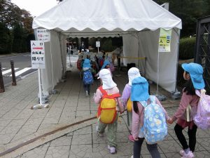 もと来た地下道を戻り正門から芝生広場に行きました。自分のレジャーシートを広げ、お弁当を準備しました。」トイレを済ませてから、やっとお弁当です。保護者の皆さま本当にご苦労様でした。