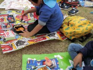 子ども達は家から持ってきたお弁当を、朝から楽しみにして、おいしそうに食べていました。少し遊んだ分いっぱい疲れて戻ってきました。いつもとは違う場所に行っていっぱい動いた一日でした。