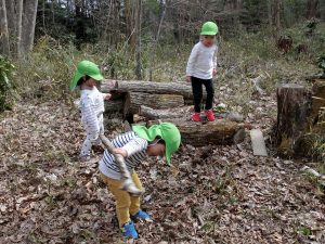 春休みの現在は、2号認定、新2号認定、3号認定の保育です。森の中ではりんご組の行動半径が広がっているのが良く分かりました。にじ組もそら組も自分の好きな遊びをしています。