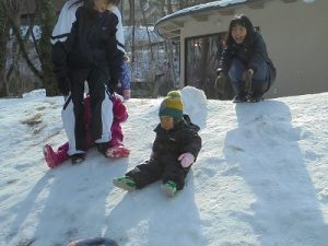 温度はなかなか上がらず今日も寒い日ですが、風があまりないので雪遊びが満開です。「なかよしすべり」する人、とにじ組の先生が声を掛けると「はーい」」と集まってきて、地下1階の斜面を手を繋いでお尻で滑って行きました。「うわー」と楽しそうな声(先生が1番楽しそうかな?)この楽しさを見逃すはずはありません。次々よってきて「なかよしすべり」でにぎわっていました。