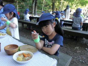 「大事なお知らせです。カレーの中に星形のニンジンが入っています。よく見てくださいね。」「あった!」「ラッキーなことがあるかもね。」切株のセミは形がしっかり「セミ型」になっていました。森の木漏れ日は消え、次第に森は薄暗がりになってきました。