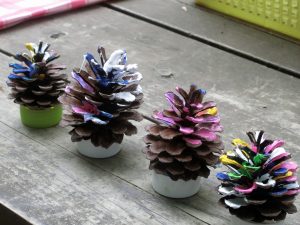 綿棒で松ぼっくりに色をのせていました。さかさまにして出来上がったユニークな飾りもありました。終わった人が森で何かを始めました。