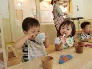 お昼近くなると暑くなって森の温度と差が出てきました。未満児のお部屋に行くと給食の真っ最中です。先生に食べさせてもらっているもも組、スプーンを使っているぶどう組、りんご組は食べるのが上手でした。