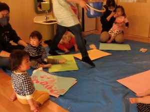 あれー!お母様のズボンの上にも手形スタンプが!「大丈夫です。」とお母さん、笑顔で子どもと一緒にペイントを続けていました。みんなで一緒の活動がこんなに続くことが驚きです。