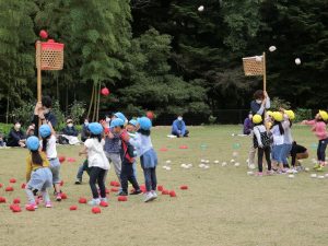 玉入れはトーナメントで4つのグループが競いました。無駄玉がないチームの投げ方を見ていたら、ジャンプしながらバスケットの様に入れているチームがあり、玉がどんどん入っていました。