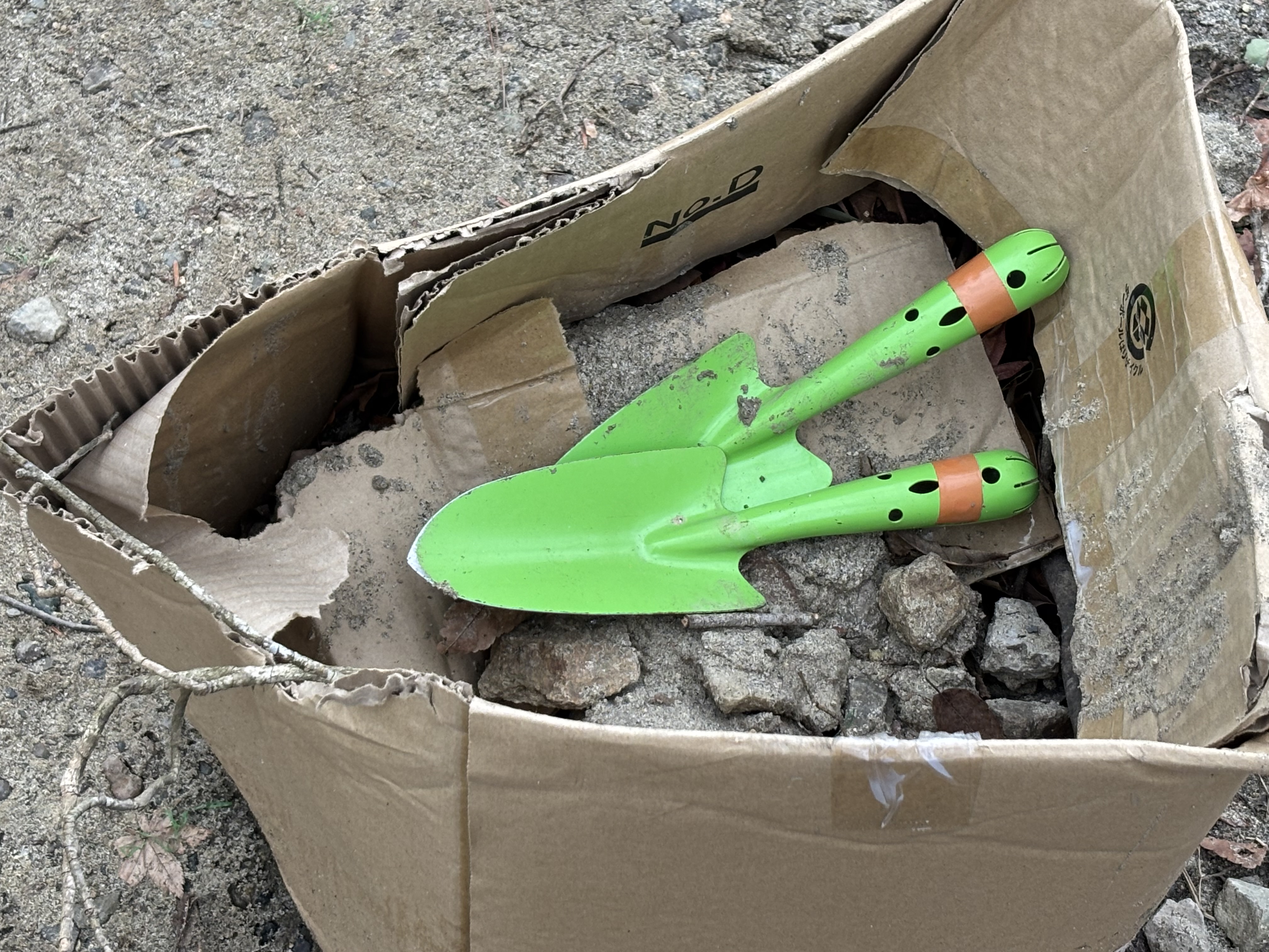 今朝、森に足を運んだ時、怪しげなダンボール箱があったので数日前の強風で飛ばされてきたのだろと思い、拾って処分しようと思い近づいてみました。すると飛ばされてきたのではなく、それどころか箱の中に明らかに子どもたちが使っていたであろう2つのシャベルと複数の石が入っているのです。土日は子どもたちが登園していませんので、金曜日の取り組みであることは察しがつきましたが、一体、誰かが何の目的で行なっていたかは全く不明でした。しかし、今日、遊びが継続される可能性もあると思い、片付けることは止めそのままにしておきました。