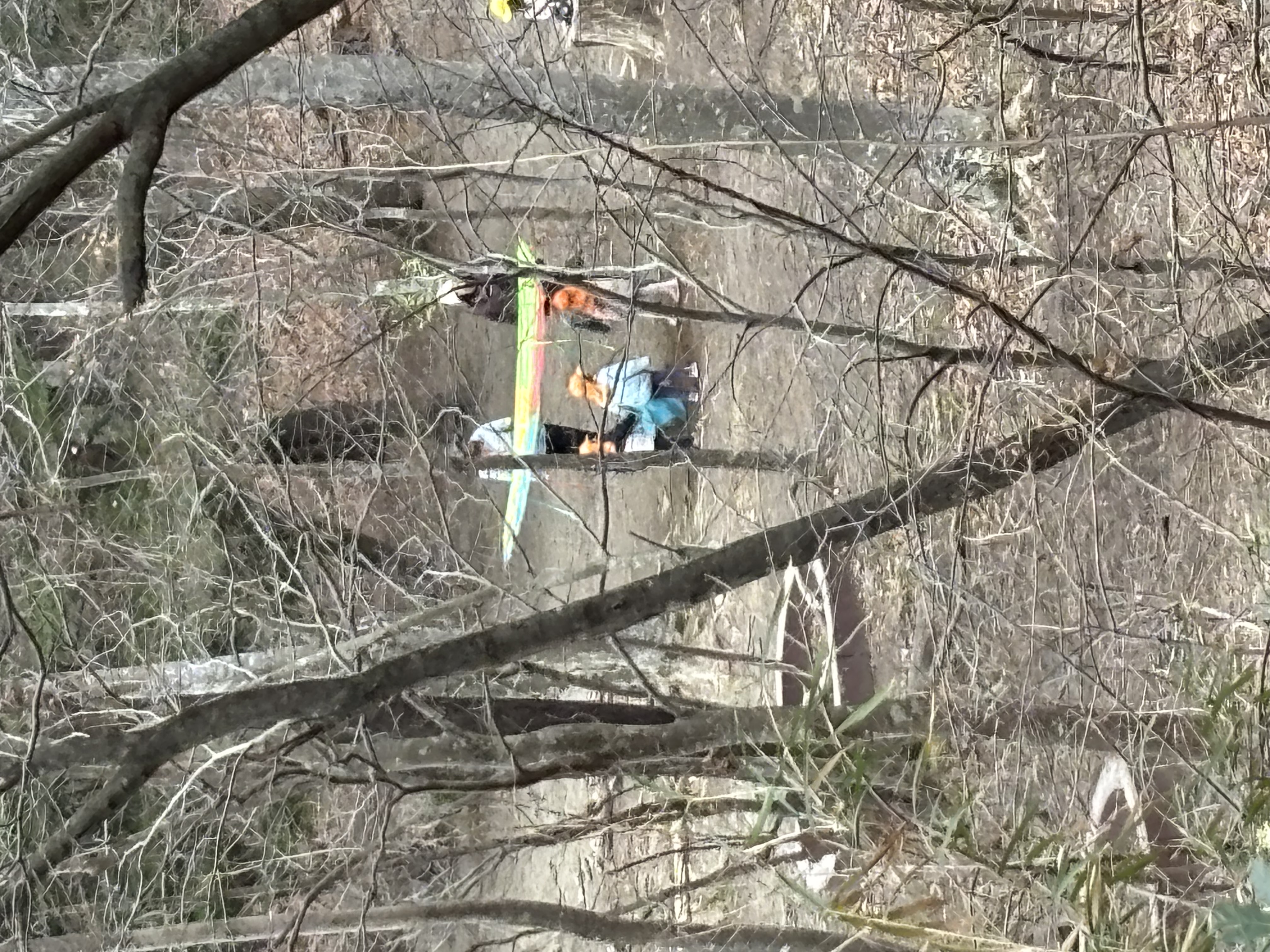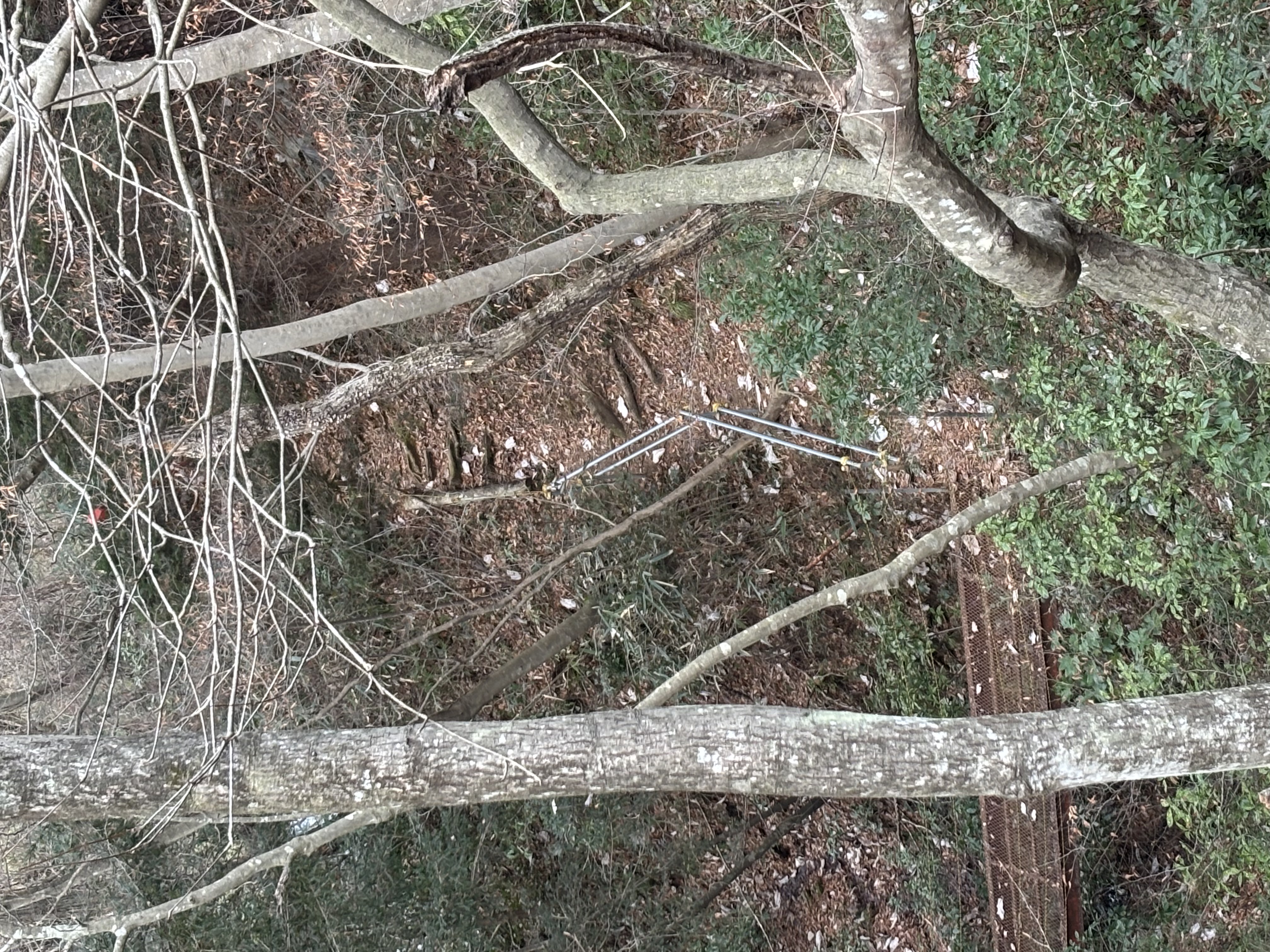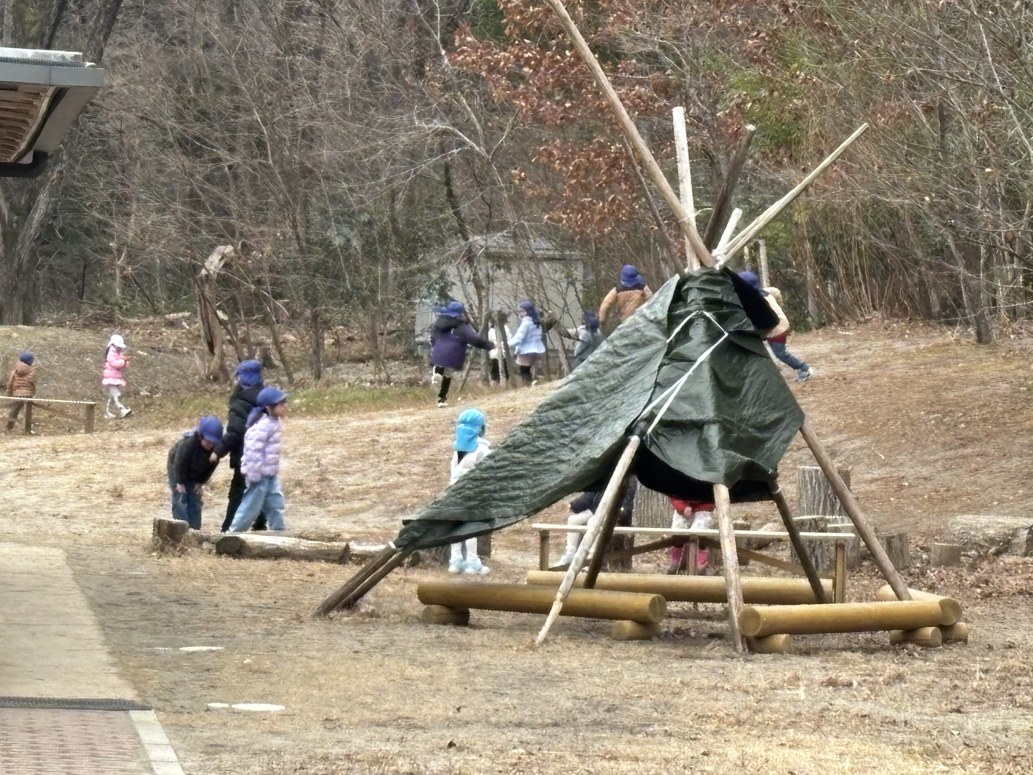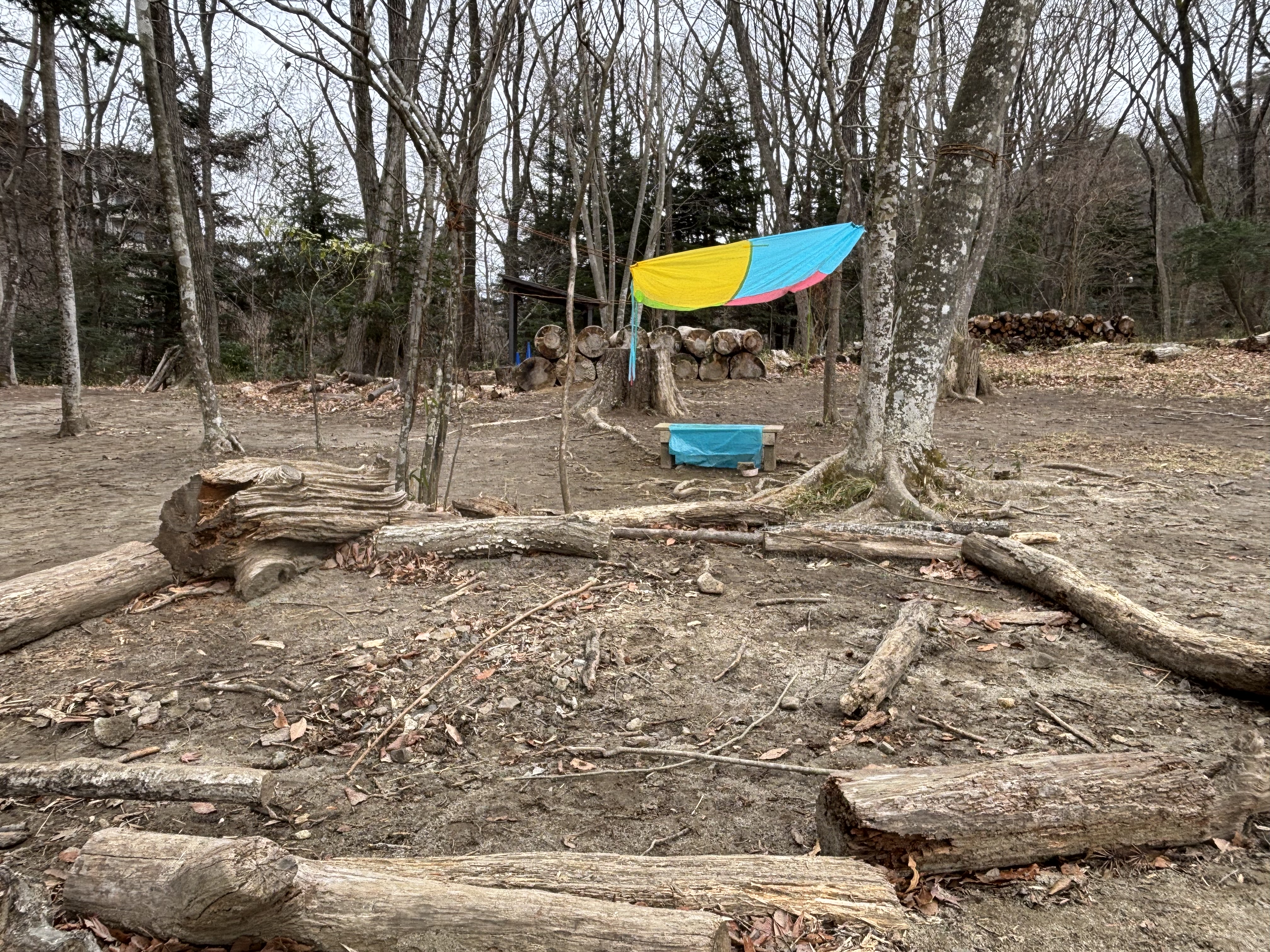 要件を終え。園に戻るために坂を下っていると給食を食べ終えた子どもたちの楽しげな声が聞こえてきます。そこで、声のする方を見てみると森の木と木に鮮やかな布かシートが張られそこで何かが行われているのが見えました。そこで、急いで園に戻ったのですが、南園庭で遊んでいる子どもたちの様子は確認できたものの、森に行ってみた時には降園と午睡の準備の時間になってしまっていて、残念なことに一足違いで子どもたちが楽しく遊ぶ様子を見ることができませんでした。