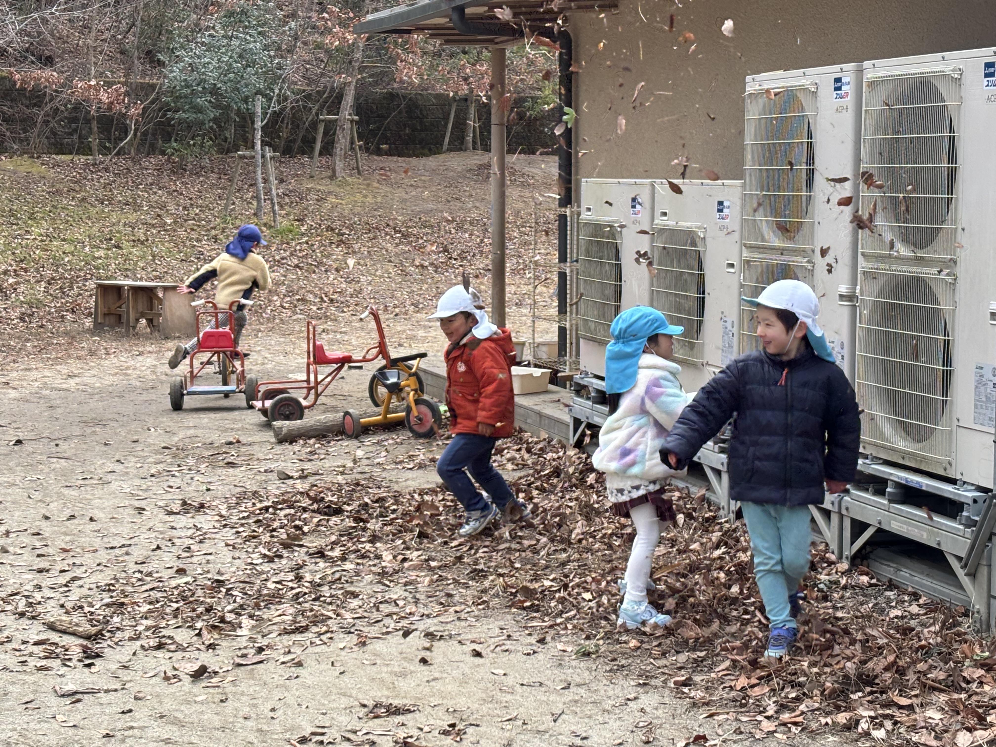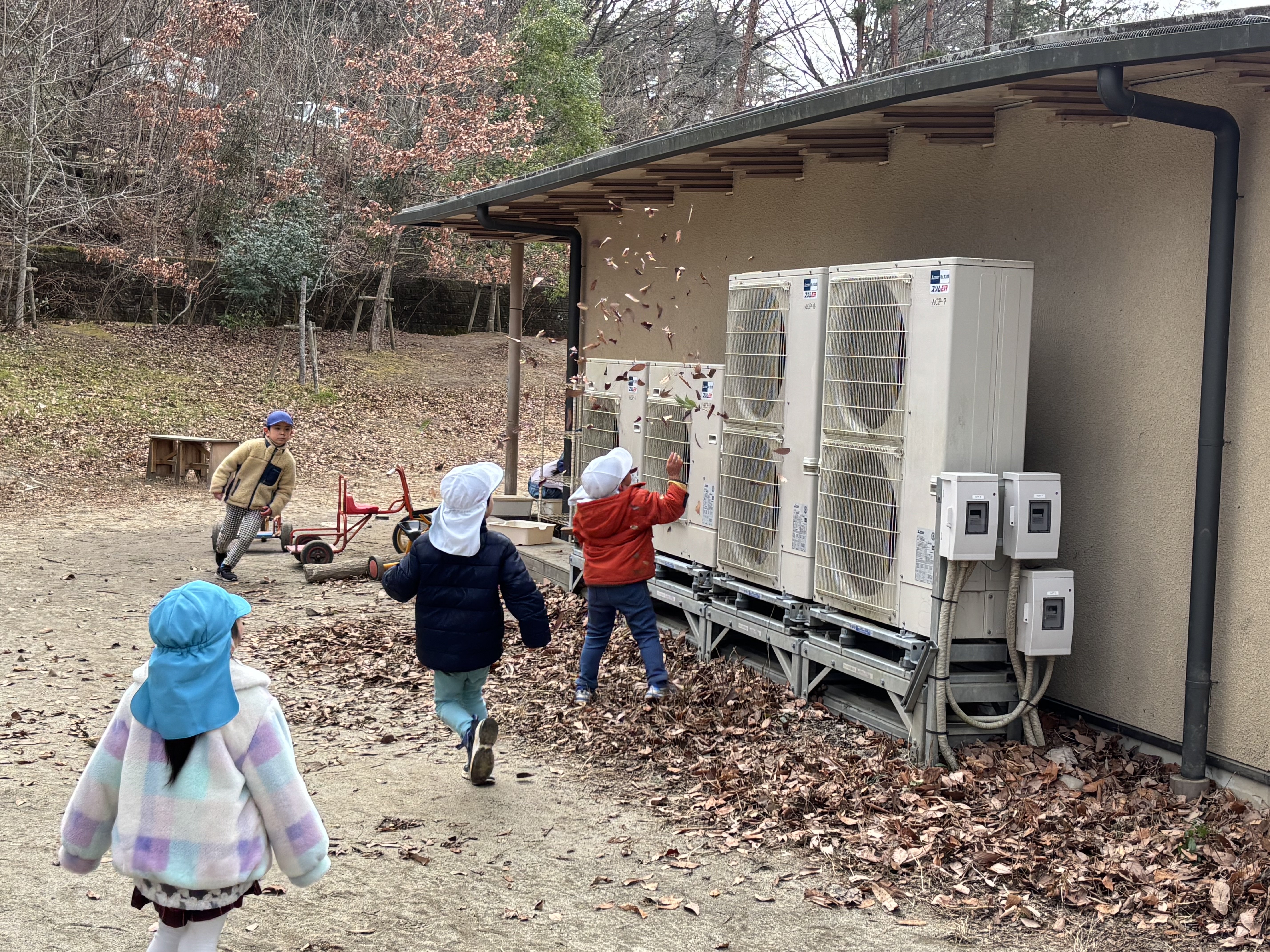 しかし、別なところからケラケラ笑う声が聞こえてきたので目を転じてみると、4歳児そら組のK君とR君が落ち葉を握りしめたかと思ったらエアコンの室外機から噴き出す風に向けて落ち葉を投げて吹き飛ばす遊びに大喜びしているのです。当然のことに落ち葉は自分の方へ向かって飛んでくるのですが、それがまた楽しくて仕方がないようで、その姿に感化されたHちゃんまでが落ち葉を拾い集め室外機を格闘していました。やっぱり子どもたちは遊びの天才です。
