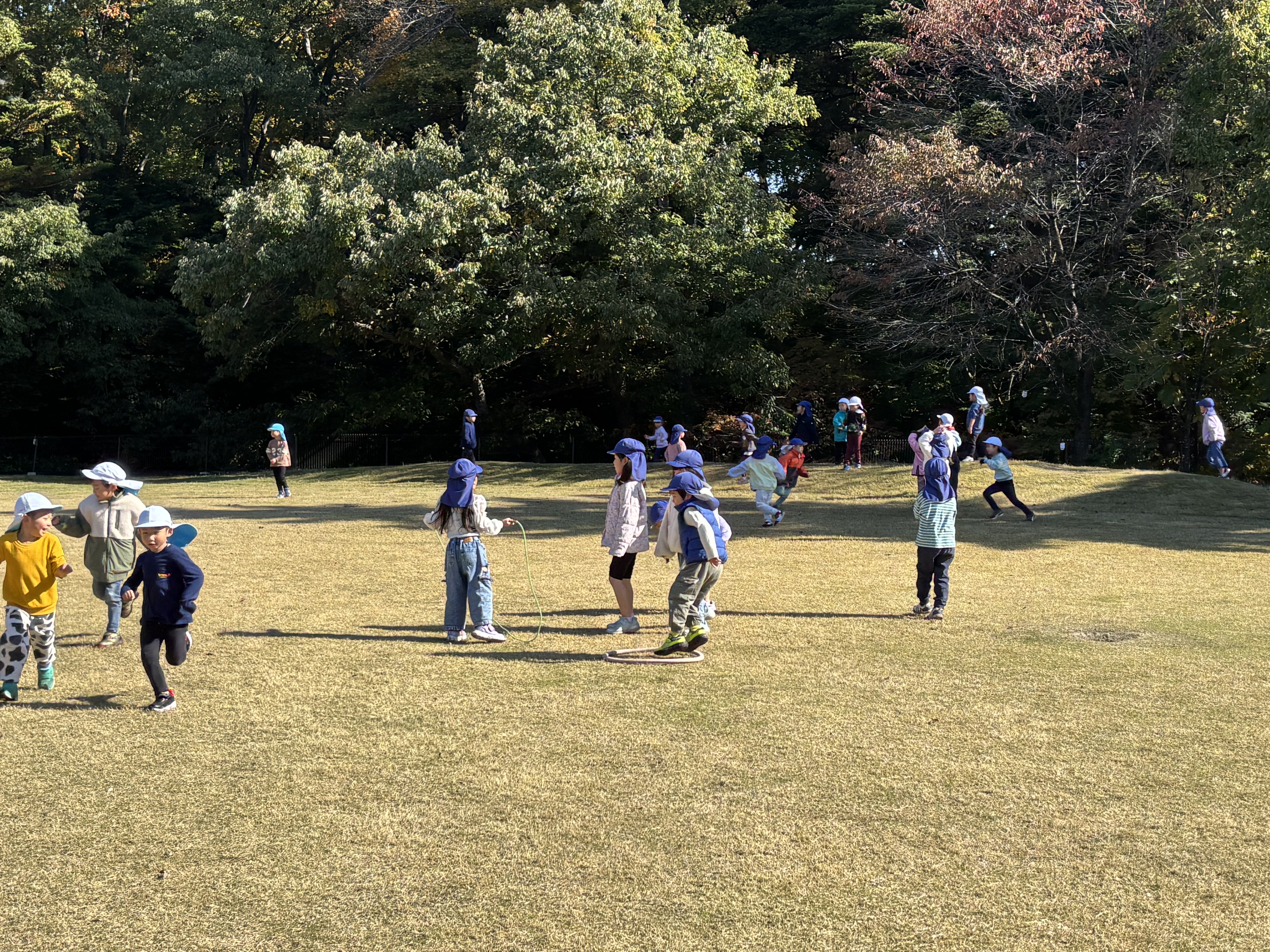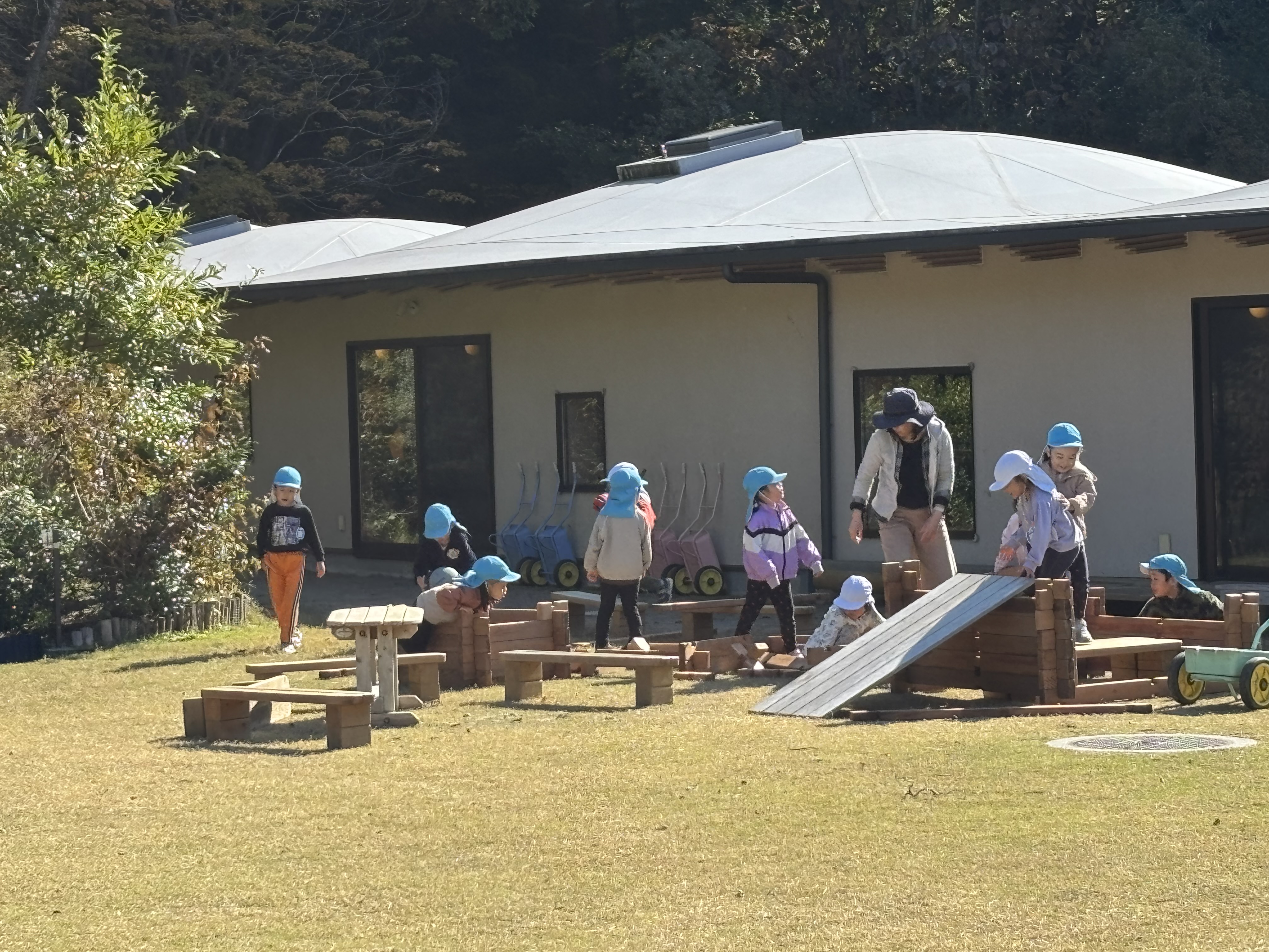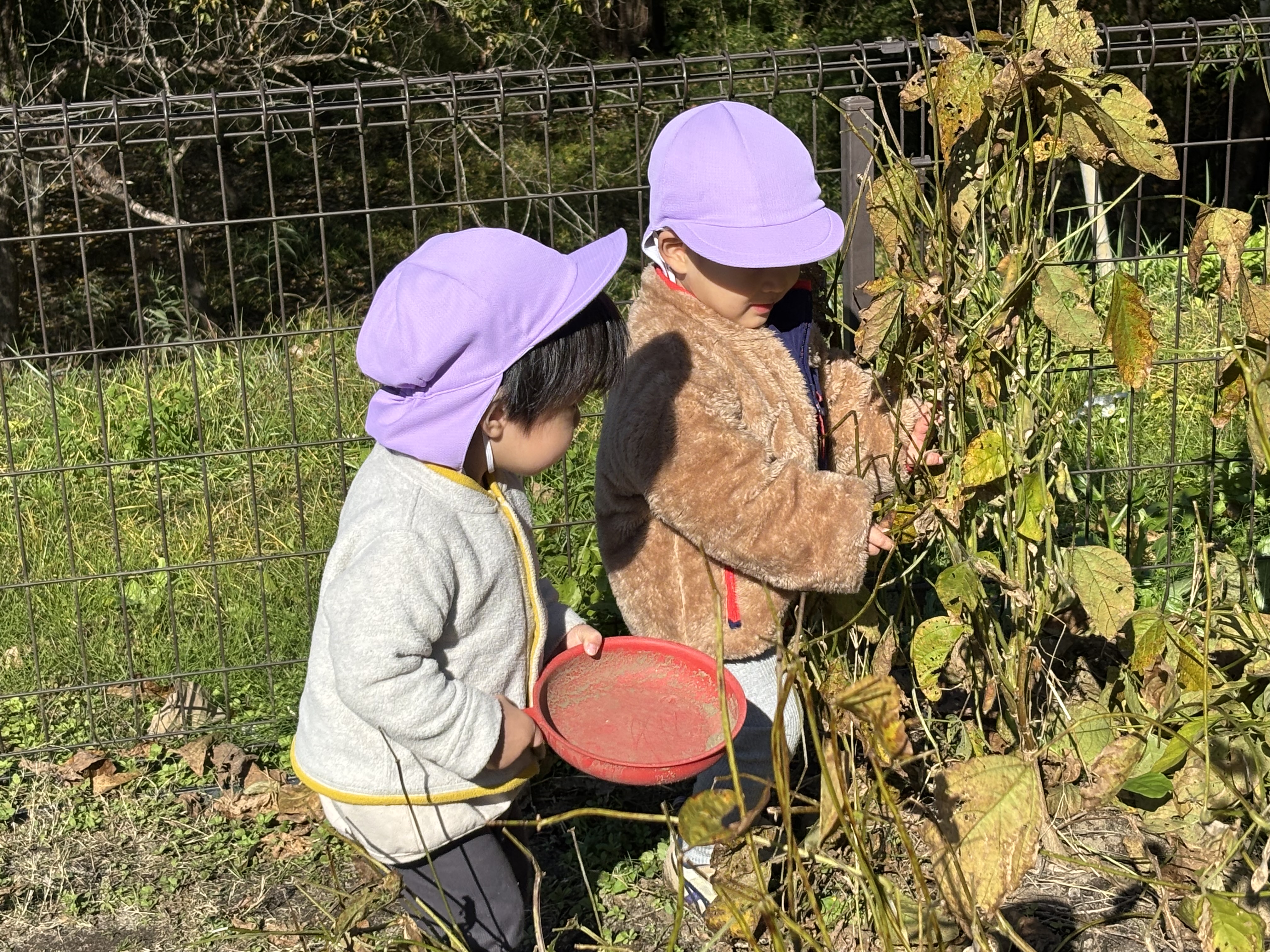 終息の気配どころか、連日伝えられるクマの目撃(出没)情報に皆さん不安を覚えていることでしょう。こども園は森が近接していることもあり、いつ、どこからやってくるとも限らないクマに先生たちは細心の注意を払いながら過ごしています。さすがに大勢の子どもたちの声が響く時間帯はクマも近づくことはないと思いたいのですが、たまたま出てきたことろが「こども園」だったなんてことがないとは言えません。かといって、子どもたちの楽しそうな様子をみていると遊びや活動を制限してしまうのは避けてあげたいと複雑な感情を抱えながらの日々が続いています。子どもたちはそんな先生たちの気持ちを知る由もなく、今日も歓喜の声を上げながら北園庭を駆け回っていました。 また、1歳児ぶどう組のH君とR君は、よほど枝豆畑が気に入ったのか、畑の中を只々行ったり来たりして遊んでいました。