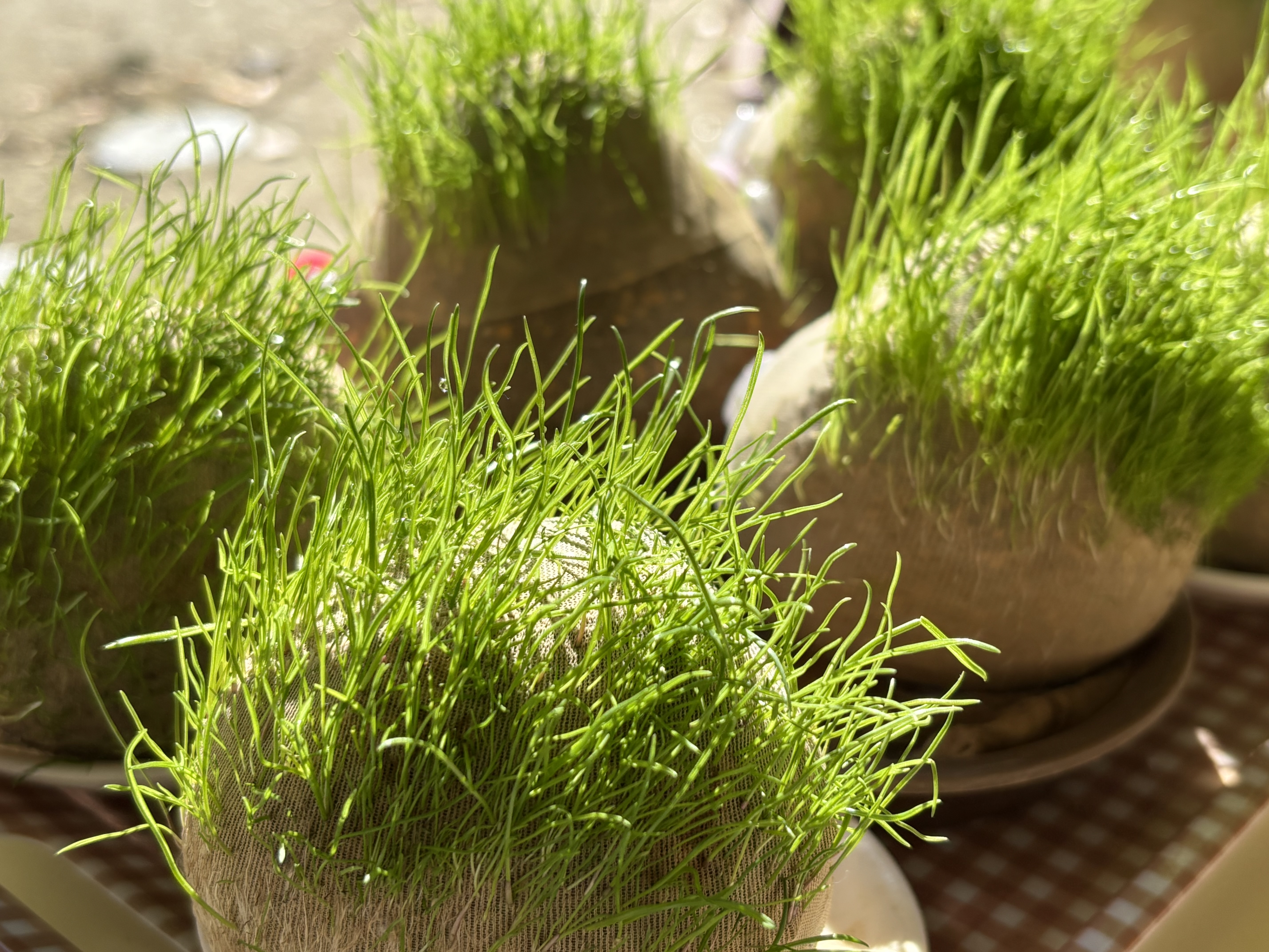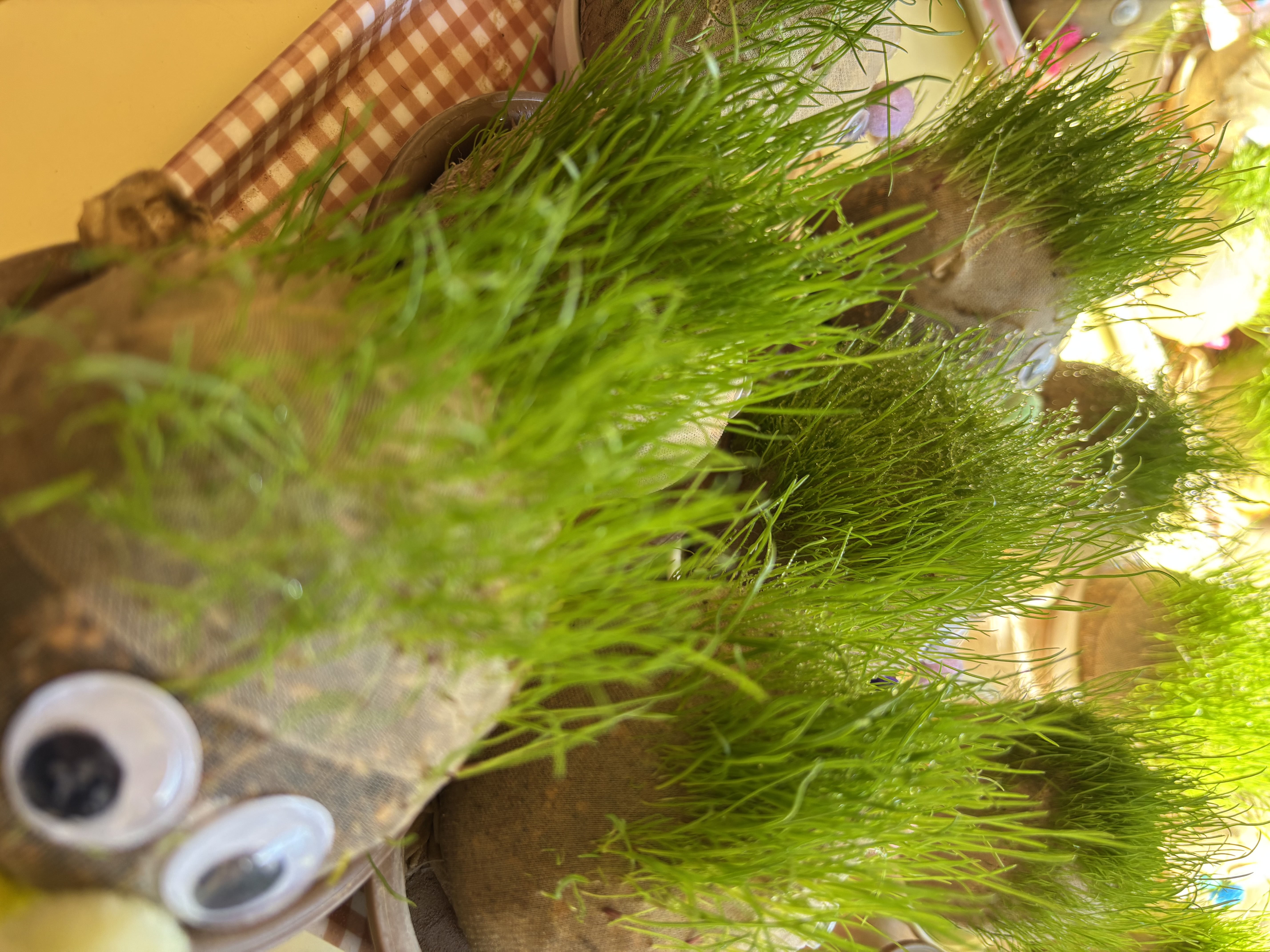 一方、明日から始まる芸術祭に向け、ディスプレーがなされた園舎内は普段の趣とは違いとても賑やかです。また、3歳児にじ組の子どもたちの芝人形がこの休み期間中にグッと伸びていて、その生長に驚かされました。