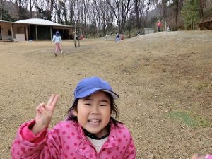 修了式の予行演習が終わった後に、以上児クラスはみんなで外に出て好きな遊びが始まりました。南園庭の斜面の上には赤いマンサクの花が満開です。フキノトウもかなり出ていました。