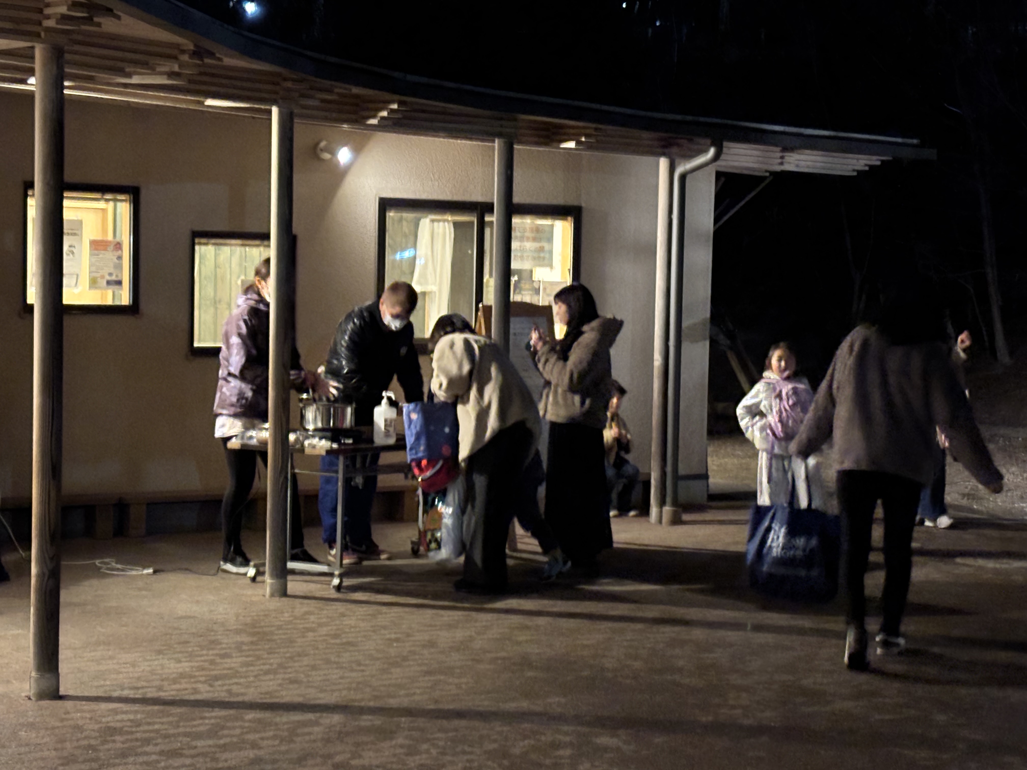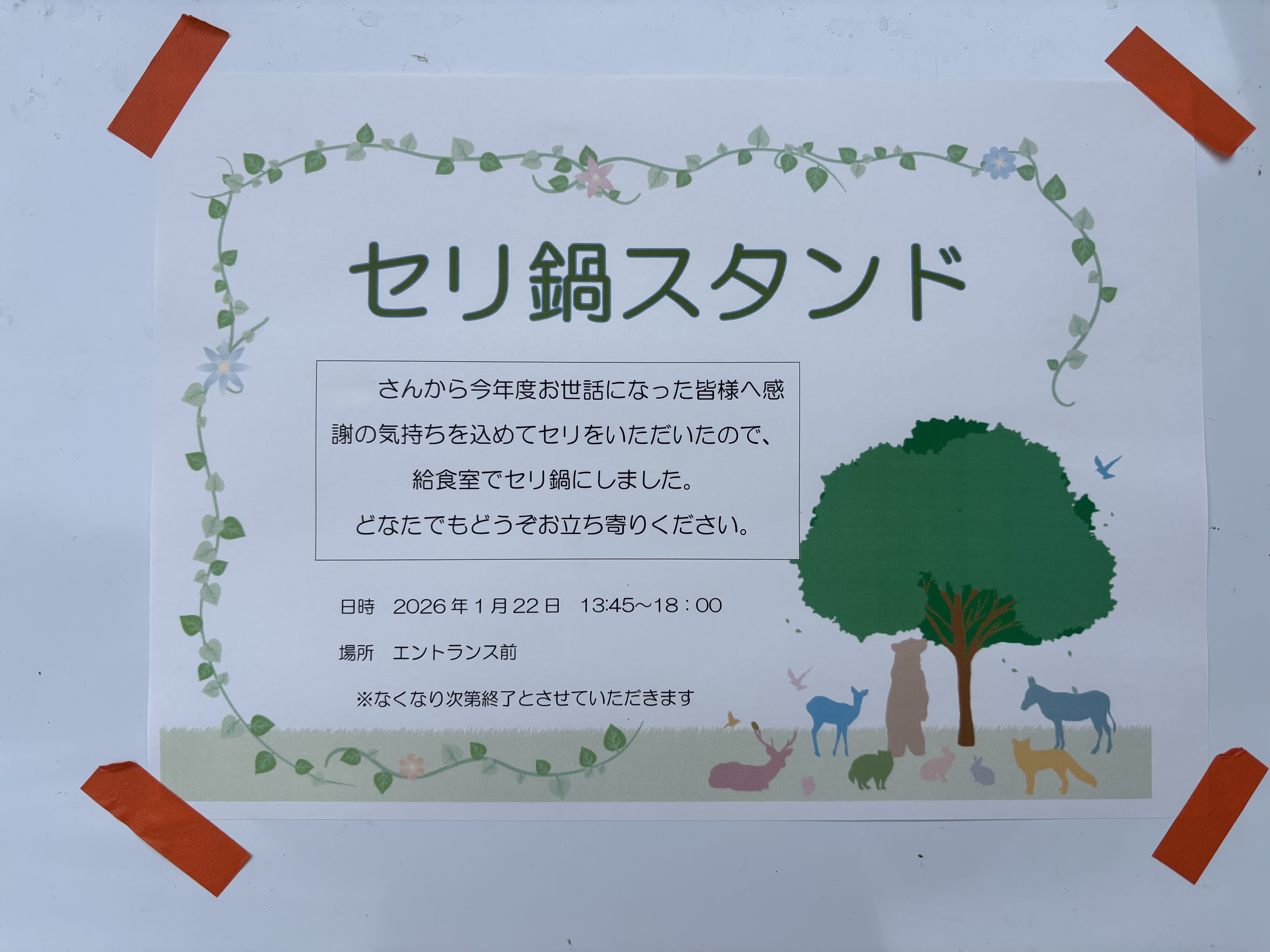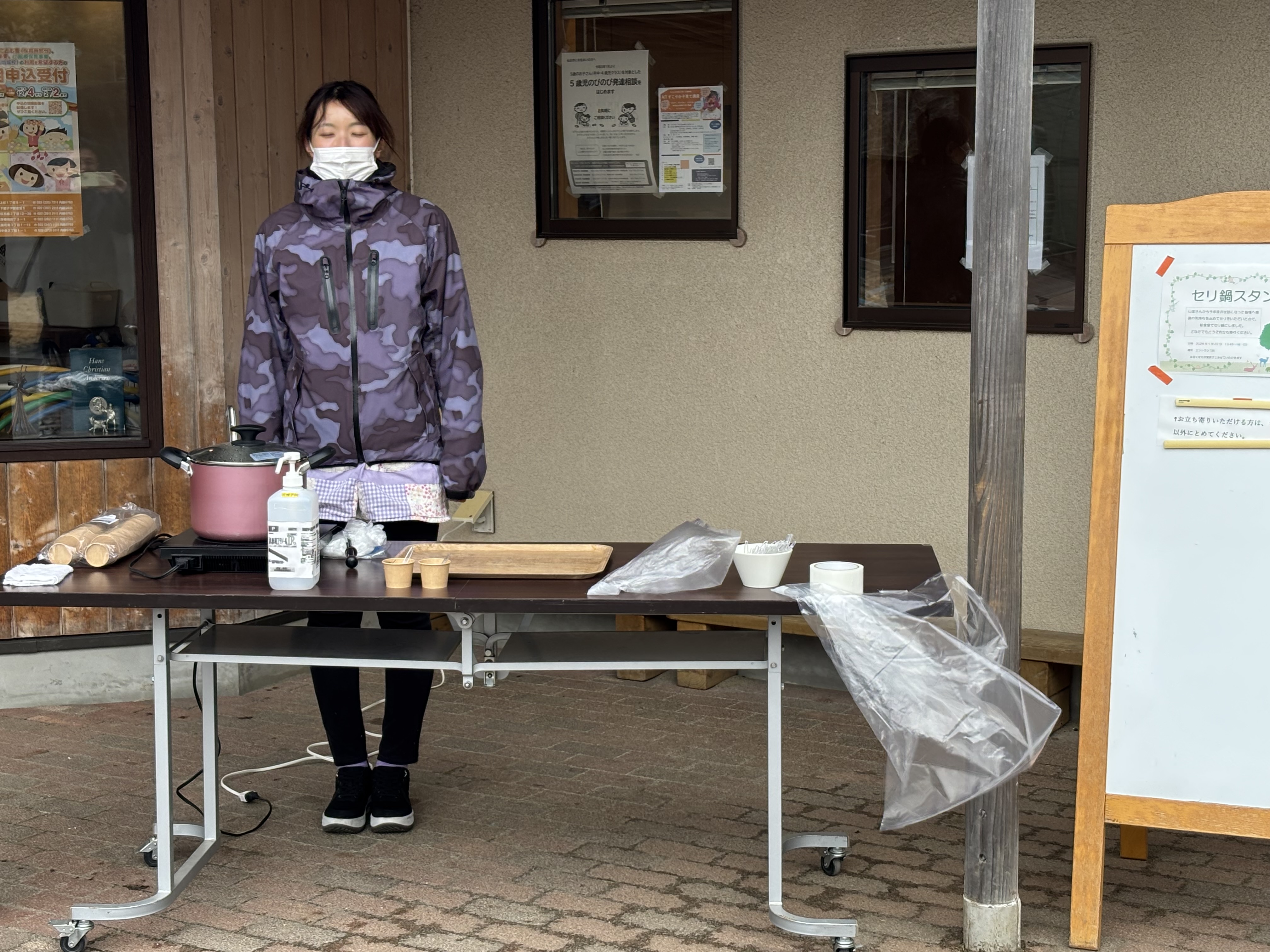 畑での野菜の栽培も春を待たなければならない端境期真っ只中、しかし、畑の先生であるYさんはこの寒い季節だからこそ収穫できるセリを給食の食材として納品に来園してくださいました。その際、栄養士のY先生が企画してくれたセリ鍋スタンドで使うセリを野菜をお買い求めいただくなどお世話になっている保護者の皆様に食べて欲しいと無償で提供してくださいました。そのお陰で1号認定の子どもたちが降園する14時にオープンしたセリ鍋スタンドは夕方暗くなった18時頃までお迎えにいらした保護者の皆様と子どもたちで賑わいエントランスとロータリー付近は寒い中でも和のいい香りと笑顔が広がりました。管理栄養士のY先生の心と身体が温まる企画に賛同し、極寒の中、収穫した食材を提供してくださったYさんの粋な計らいは「おもてなし」であり「表無し(裏だけ)」なんてことはなく只々感謝です。