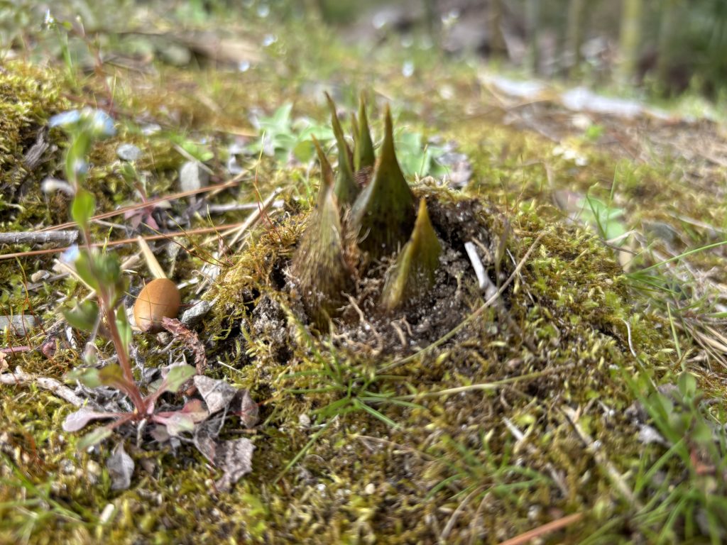 数日前に降った雨と昨日今日の暖かさがスイッチになったのか、ついに北園庭のフェンス越しにある竹林の根元がヒビ割れ筍が顔を出し始めました。明日、明後日のお休み明けの月曜日には土に隠れている、その他の筍も伸び出してくることと思われ、それを見つけた子どもたちがクッキングや給食の食材として使用するために筍掘りと皮剥きに興ずる姿がしばらく見られる(続く)ことになるでしょう。