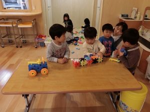 以上児の子ども達はお帰りの会の真っ最中でした。にじ組はそれぞれ作ったお雛様を先生が紹介して見せていました。お話しを聞くのが上手になりましたね。そら組は《いつまでもともだち》の歌の練習をしていました。最後の1分間小さな先生になってお話している友達がいましたが、口調が先生にそっくりでした。