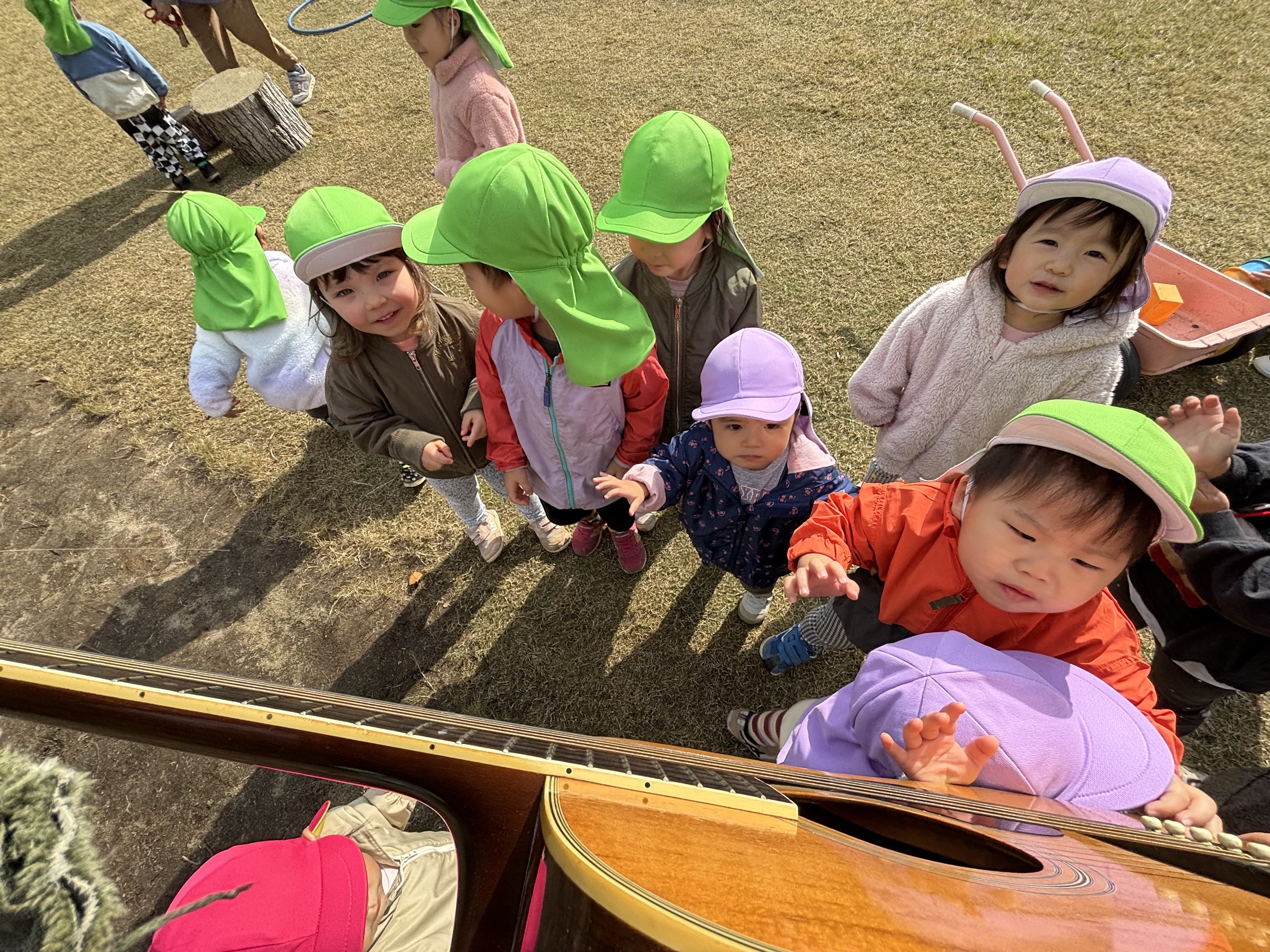 ギターに興味津々の子どもたち、弦に触ったり叩いたり音と感触を感じてくれていました。その後、金のガチョウのお話よろしく、僕に繋がって森に出かけました。