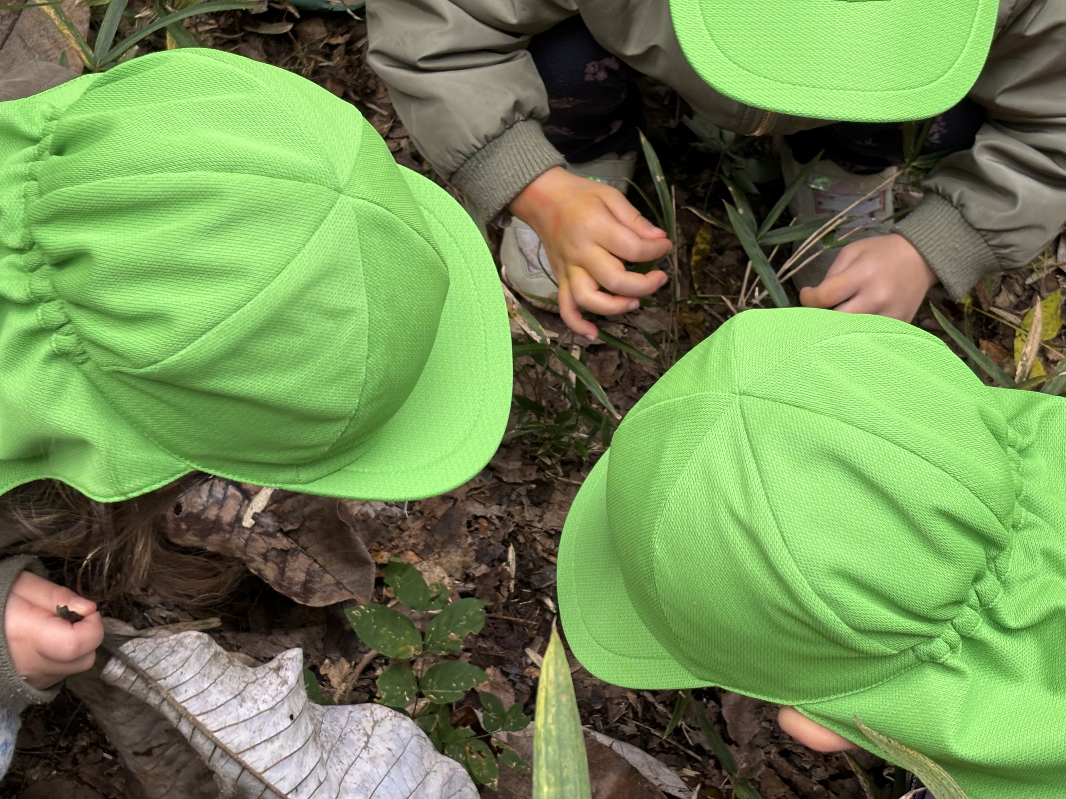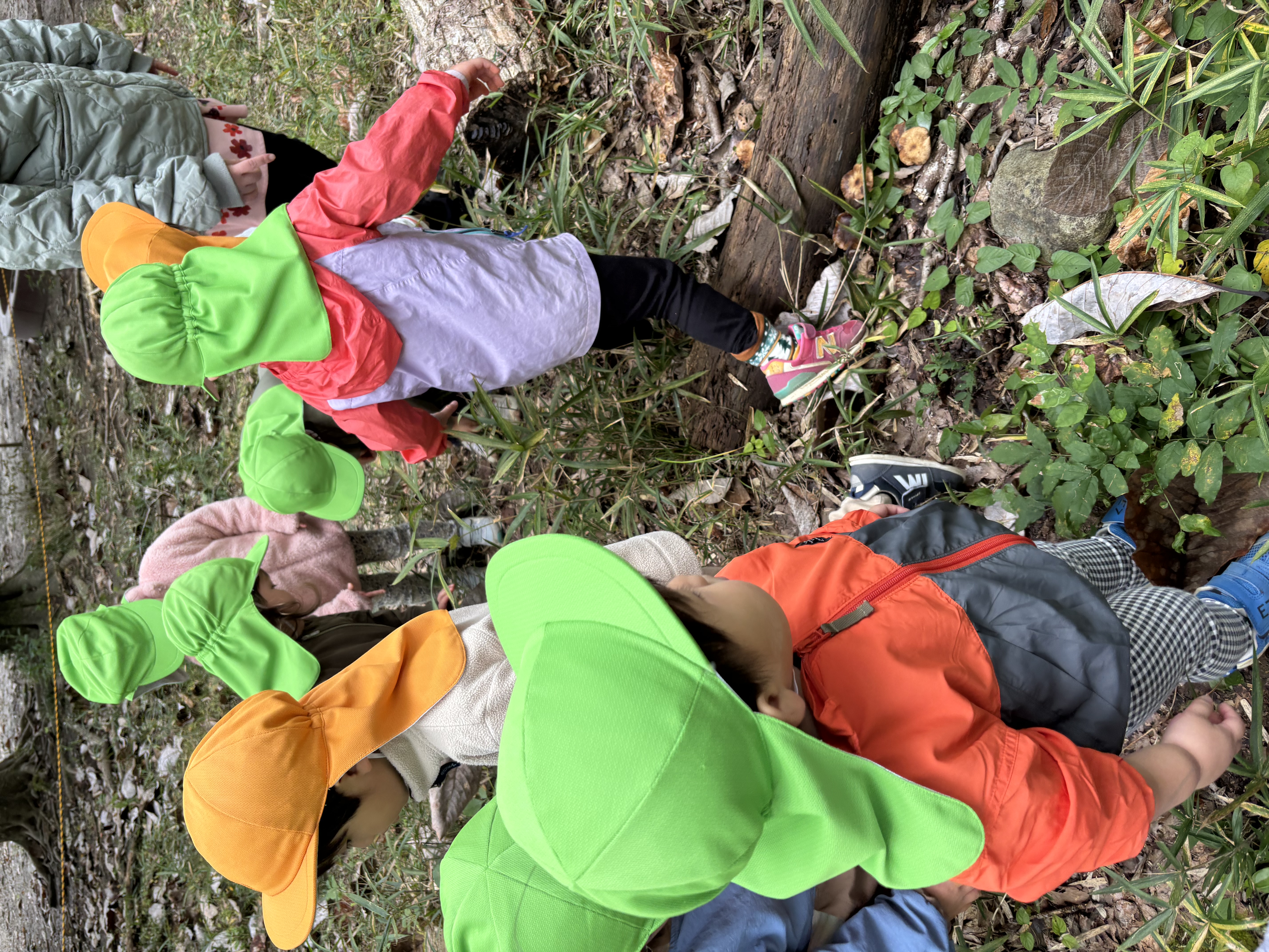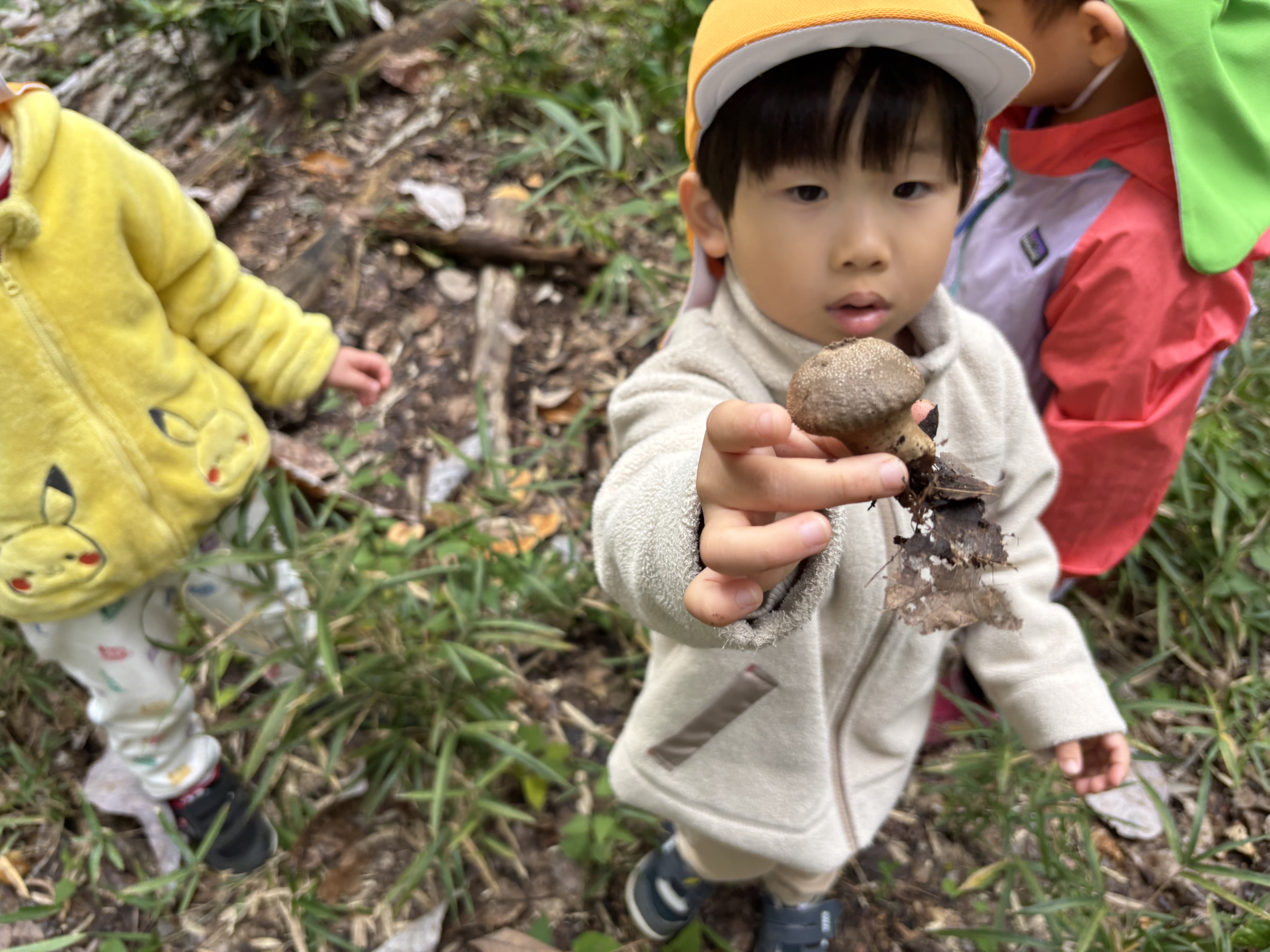 北園庭のフェンスに取り付けた忌避剤(ウルフピー)を触って、その匂い(臭さ)に驚き、大慌てで手を洗うことになったというMちゃんの様子を見に行ってみようとテラスに出たところ、「園長先生、今日、S先生の誕生日なのでギターを持ってきて欲しいんですけど・・・」とのリクエストがありました。そこで、ギターを取りに戻り子どもたちとS先生の誕生日をお祝いしたのですが、お祝いした後、ギターが気になって仕方がない子どもたちに取り囲まれてしまい、動こうものなら後ろからついてくるのです。そこで、キノコ博士のR君も誘いながら、子どもたちを引き連れて森に行きキノコの生えているところを教えてあげたところ目を輝かせ夢中で観察、収穫していました。その他の子どもたちも落ち葉の下で寒さを凌いでいたのか、何匹いるか分からないほどの幼虫たちに興味津々を示ししゃがんで観察する様子や玉切りした丸太のよじ登るなど、わずかな時間でしたが森で楽しく過ごしました。熊騒動が落ち着き、このような様子が戻ってくることを願いながら、できる限り外での遊びや活動を大切に過ごしていきたいと思います。