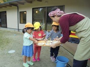 今日の午後のおやつは芝生の上です。香ばしい香り漂っていました。栄養士の先生が炭でおにぎりを焼いていました。醤油を塗った後の香りは「はやくたべたい!」気分満開です。ちゃぶ台に縦割りで本日小学校がお休みの小学生も座り嬉しい時間になりました。