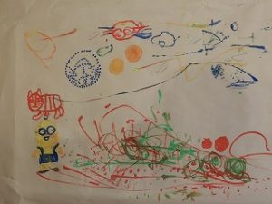 うちわに綿棒で絵を描いていたにじ組が、終わってから大きな紙に綿棒で絵を描きました。
