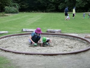北園庭ではりんご組とぶどう組が水遊びをはじめました。スプリンクラーを小さく回していましたが途中でホースのシャワーだけになっていました。自分の好きな場所でそれぞれの水遊びです。