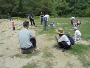 時間になったら野外炊飯場のテーブルでお集まりをしていました。みんな先生のお話がよく聞けていました。今日もカード探しゲームをすんるのかな?森の中に自分の顔を描いたカードが置かれていました。