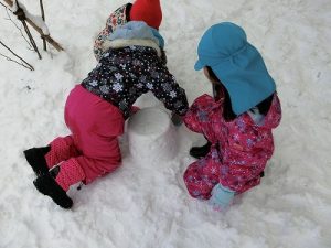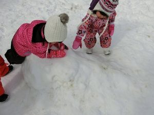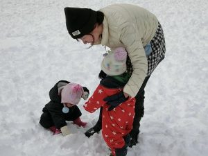 未満児も雪遊びです。ソリに乗っても雪がふわふわしているのでなかなか進みません。手で引っ張ったり、小さな築山の上から押してもらって滑っていました。可愛いスノーマンが出来上がっていました。太陽は出ていませんが風もなく遊びやすい日でした。