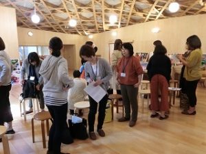 秋晴れの今日は、宮城学院に大学派遣研修でお出でになった保育士の皆様が、こども園での研修もあり皆様森の中から現れました。玄関からみんなの広場に入って映像を見ながらの研修です。玄関には園児募集の看板があります。11月1日は1号認定の入園申込み日です。