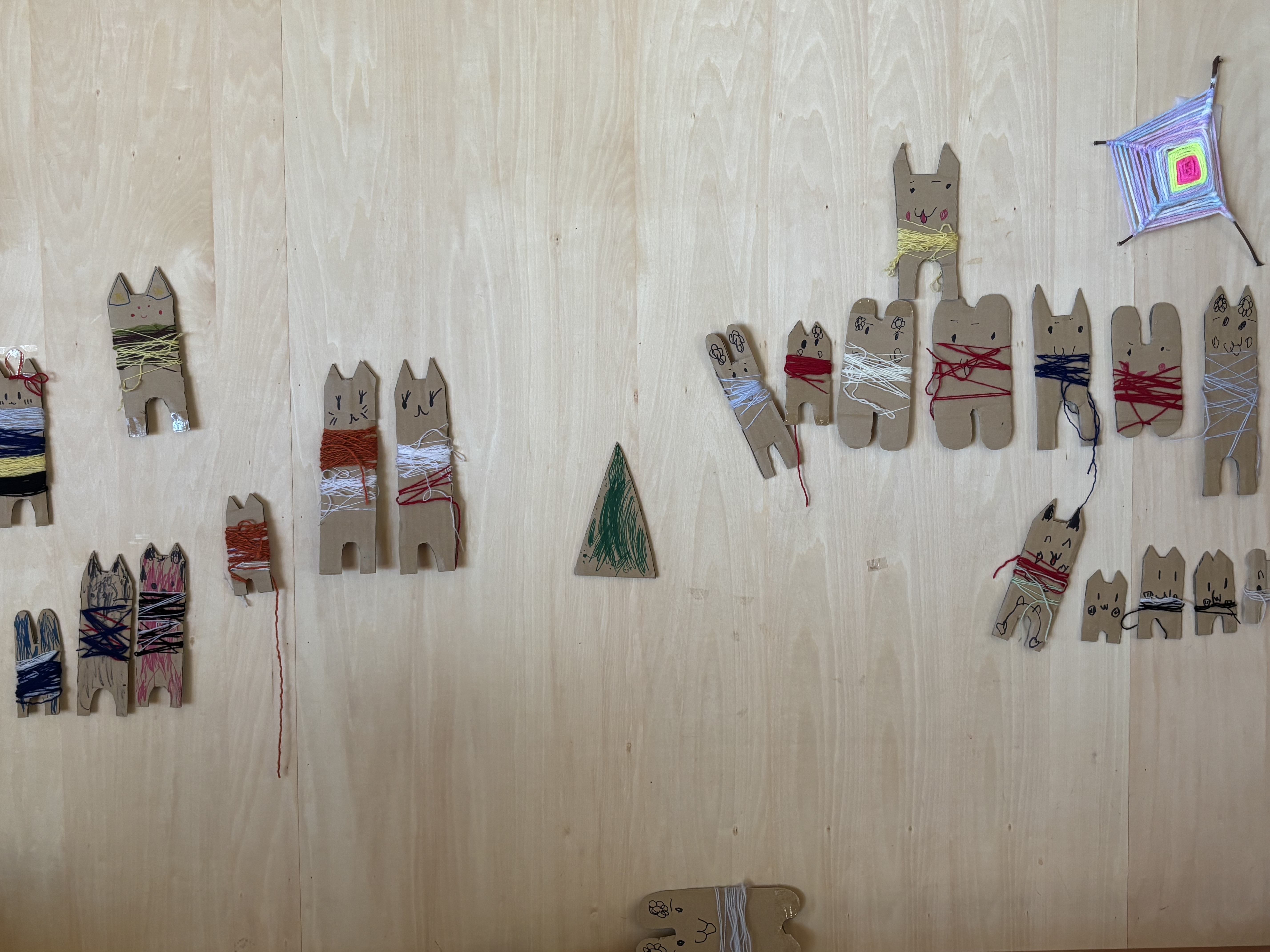しかし、乾いたパウダースノーはとても軽く、シャロン寮に片付けてあった除雪用の道具のお陰で作業がとても楽でした。雪かきの道具を取りに行った際、雪を被った園舎を見下ろしたくて建物の3階に上ってみましたが、眼下に見えるこの唯一無二で不思議な建物を見下ろしながら飛んでいる鳥になった気分でした。目的地と天気、高度によりますが、飛行機からも園舎が見えるのかも知れません。いつかそんな機会があれば気をつけて眺めてみようと思います。  2月になると、各クラスで参観コイノニアが行われます。各クラス様々な準備が始められているようですが、4歳児そら組の保育室の壁面には毛糸を使って作られた可愛らしい動物(ねこ!?)が飾られています。毛糸を巻きつけただけでも暖かさが伝わってくるのが不思議です。この後、もう少し変化していくのかとても気になります。