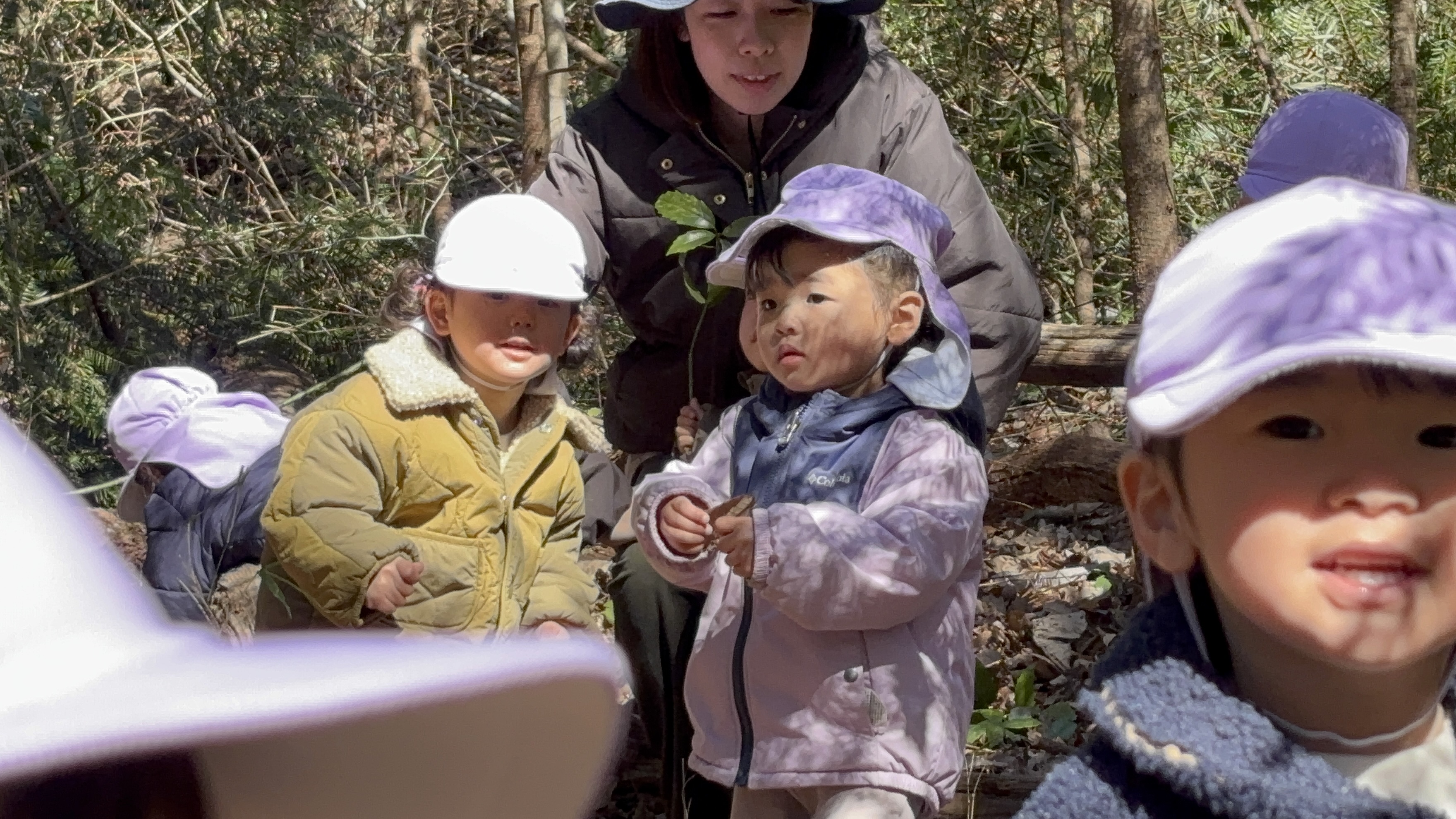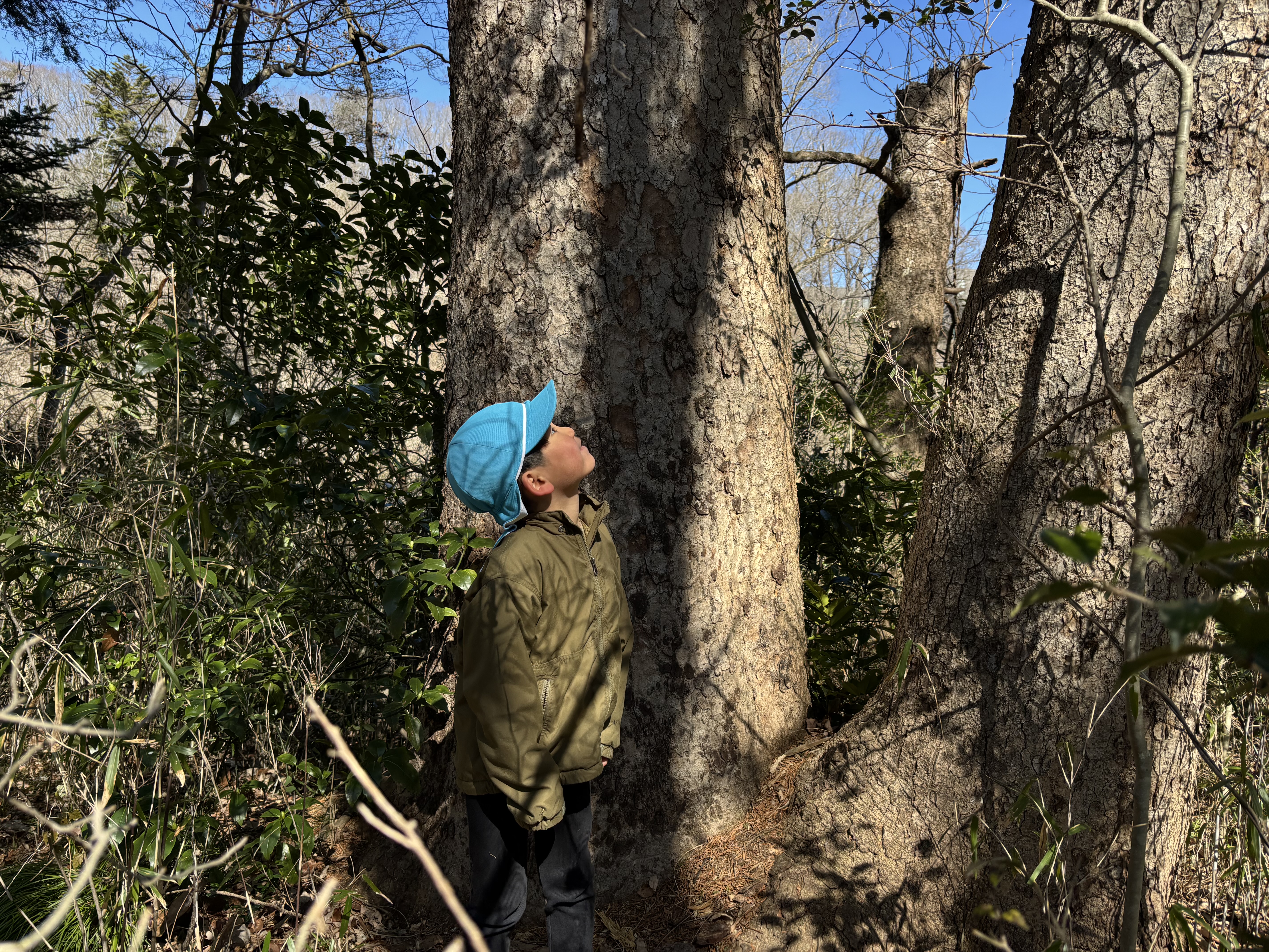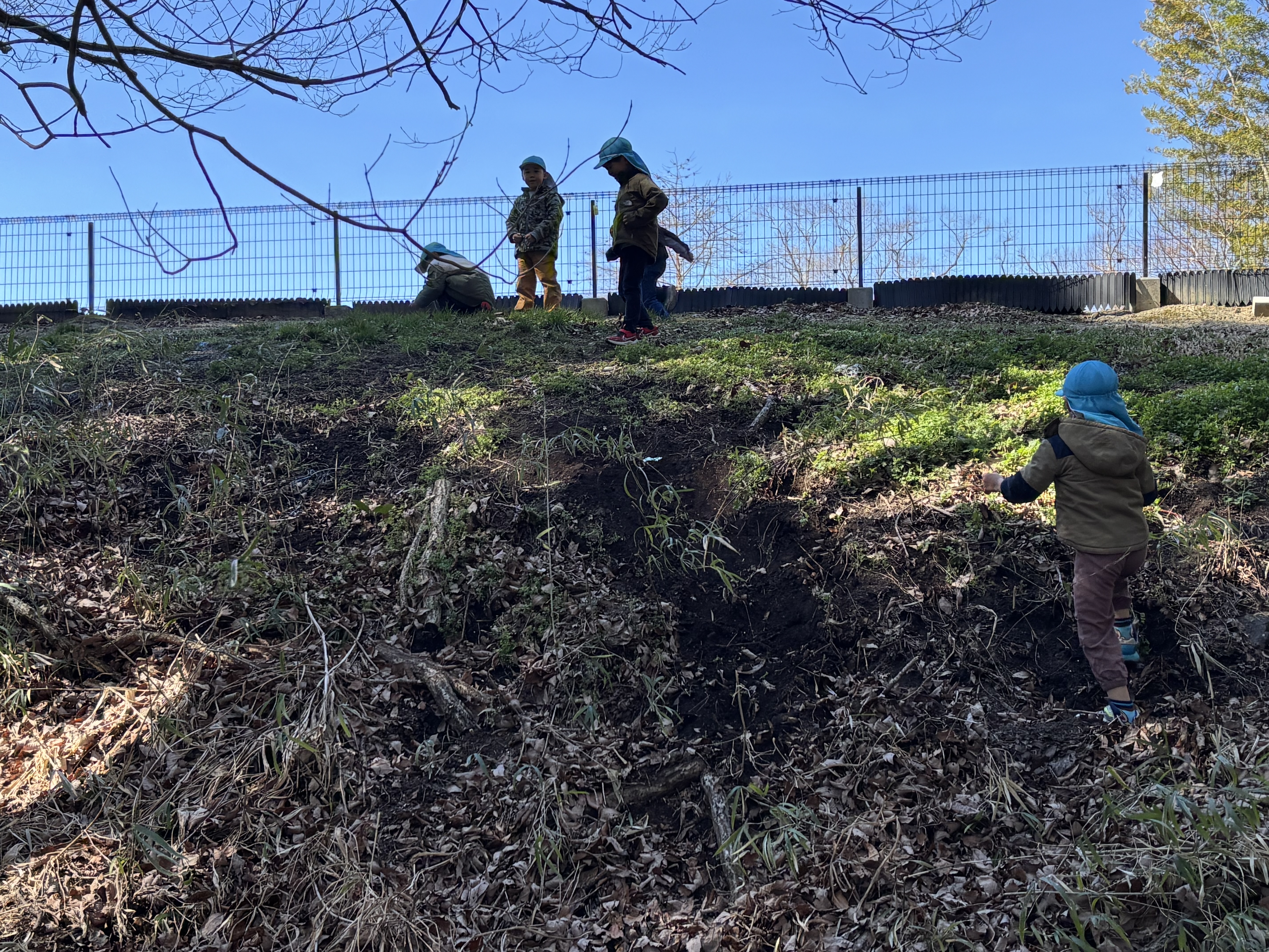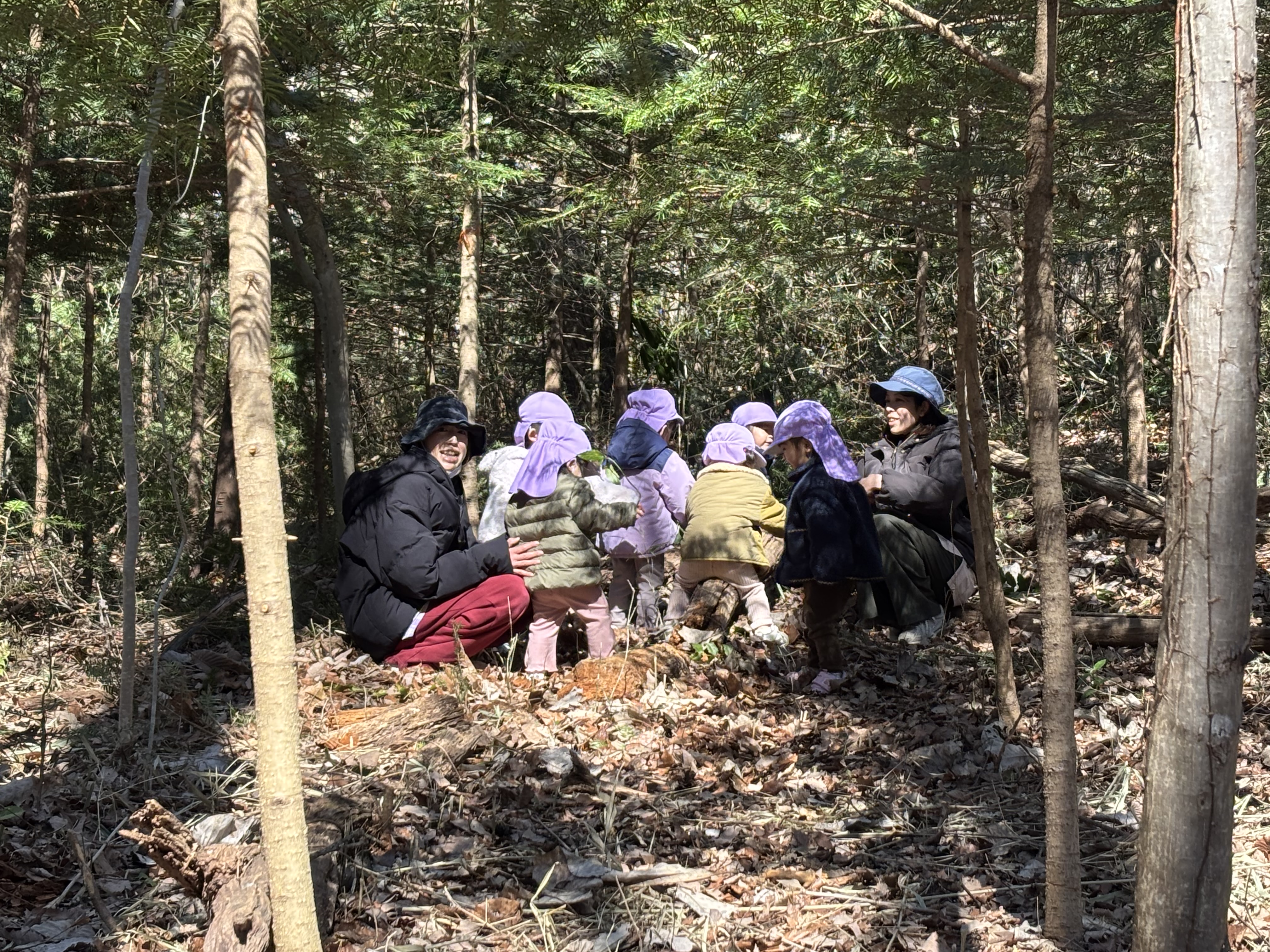 また、日に日に春の日差しが感じられるようになり、森で遊ぶ子どもたちの様子が増えてきたように感んじられます。今日も1歳児ぶどう組の子どもたちが通称「おふろ」と呼ばれている森の窪みで遊んでいましたが、朝、新たに刈り払いしてたところで巨木を見つけたことを教えてあげると、おぼつかない足取りではありますが、自分の足で森の奥まで歩き、この森で何年間も根を張り大きく育った木を眺め、登ってみるなど森を楽しみました。そら組の男児たちは通称「トランポリン」に新たな木を運びぴょんぴょん跳ねていましたが、その下では「ここ僕のお家」と嬉しそうなA君の笑顔が見られました。