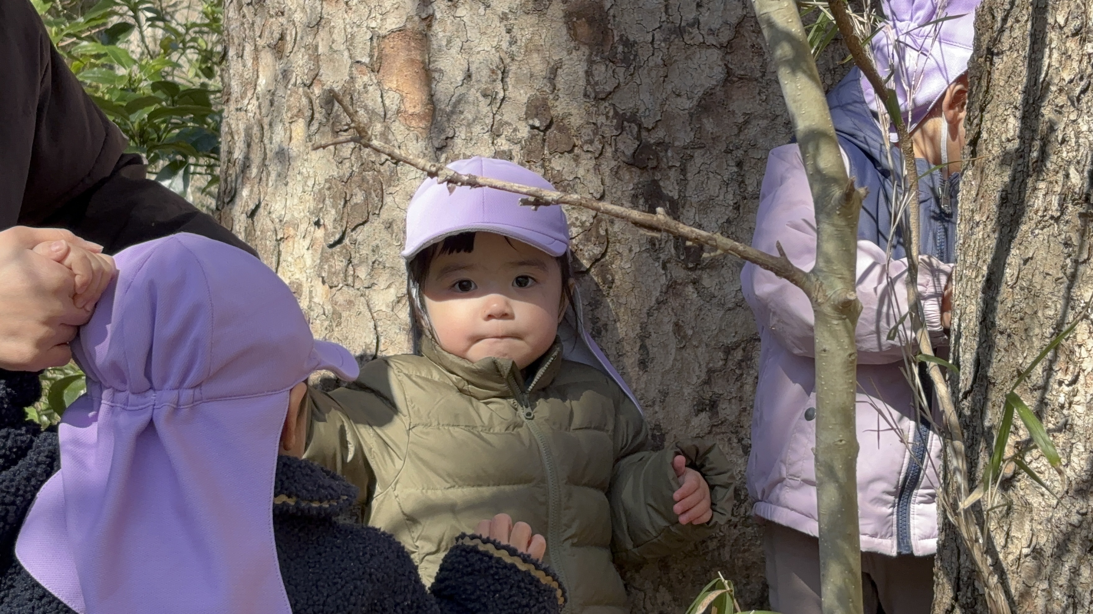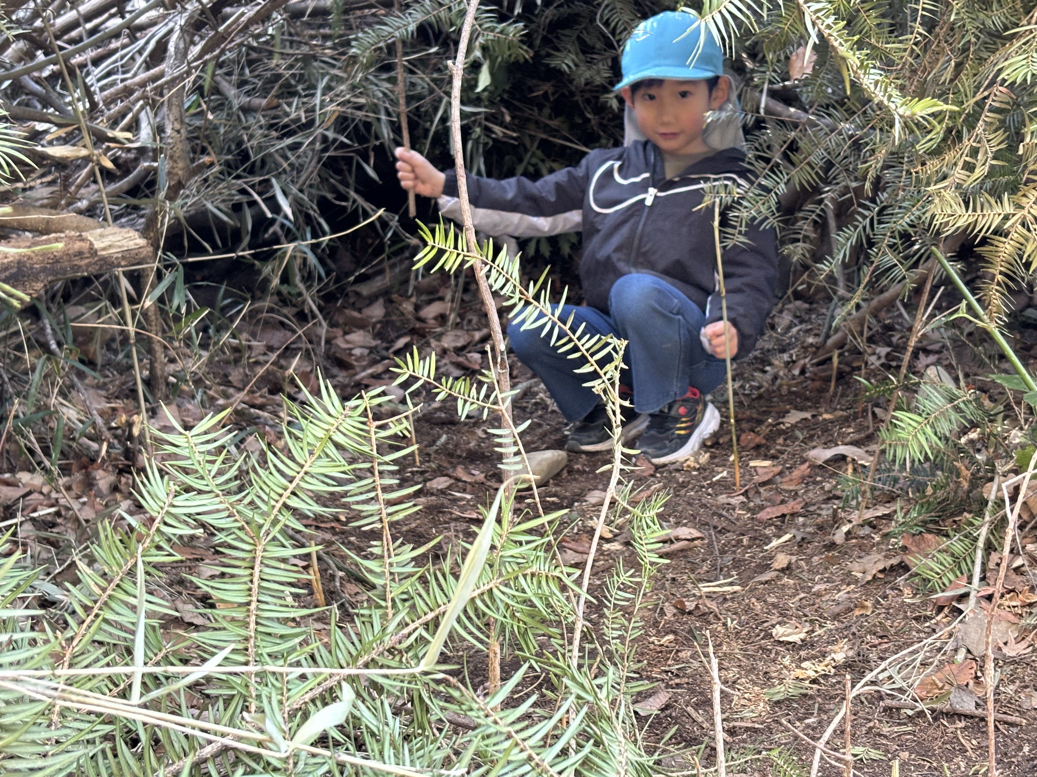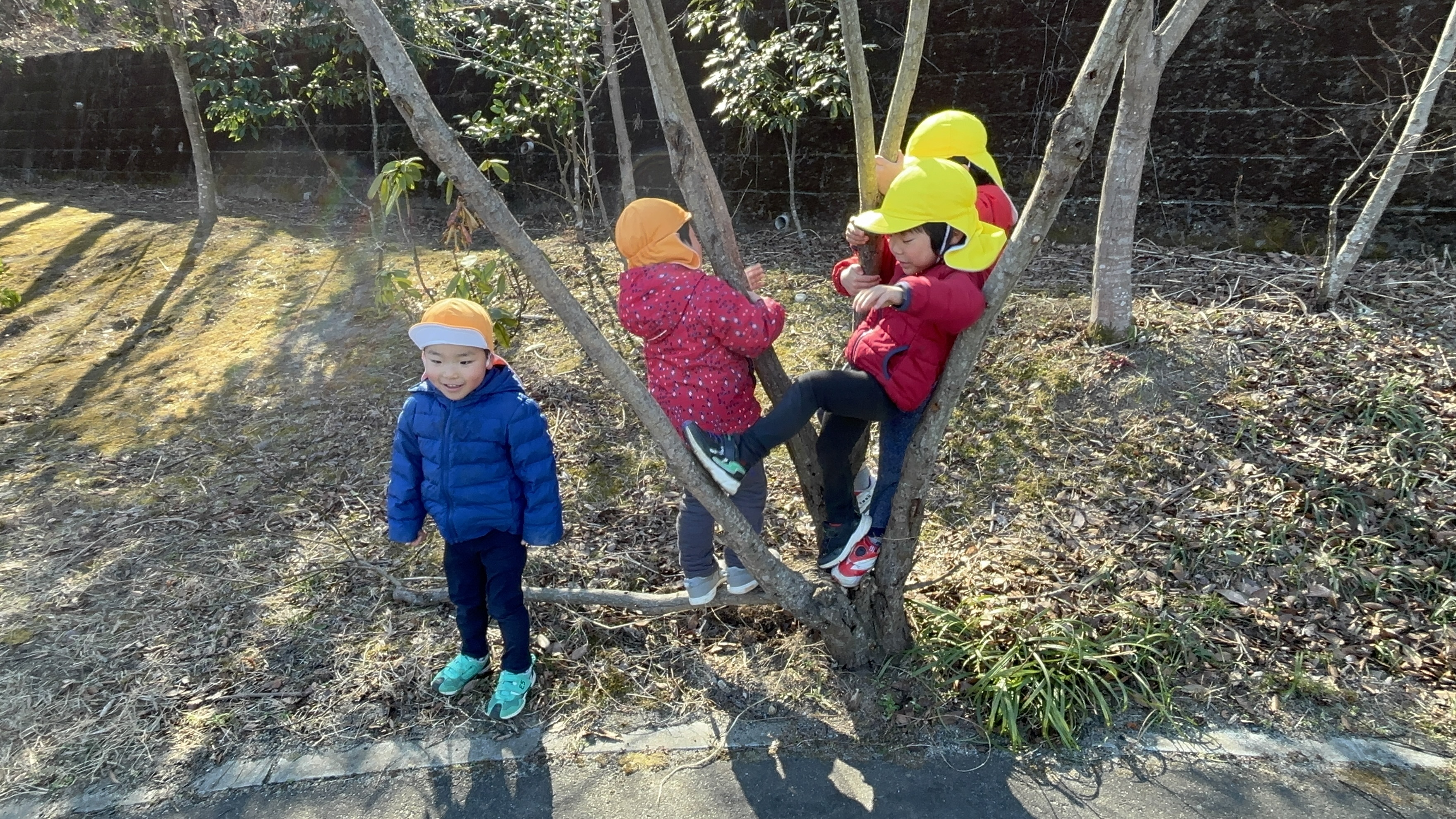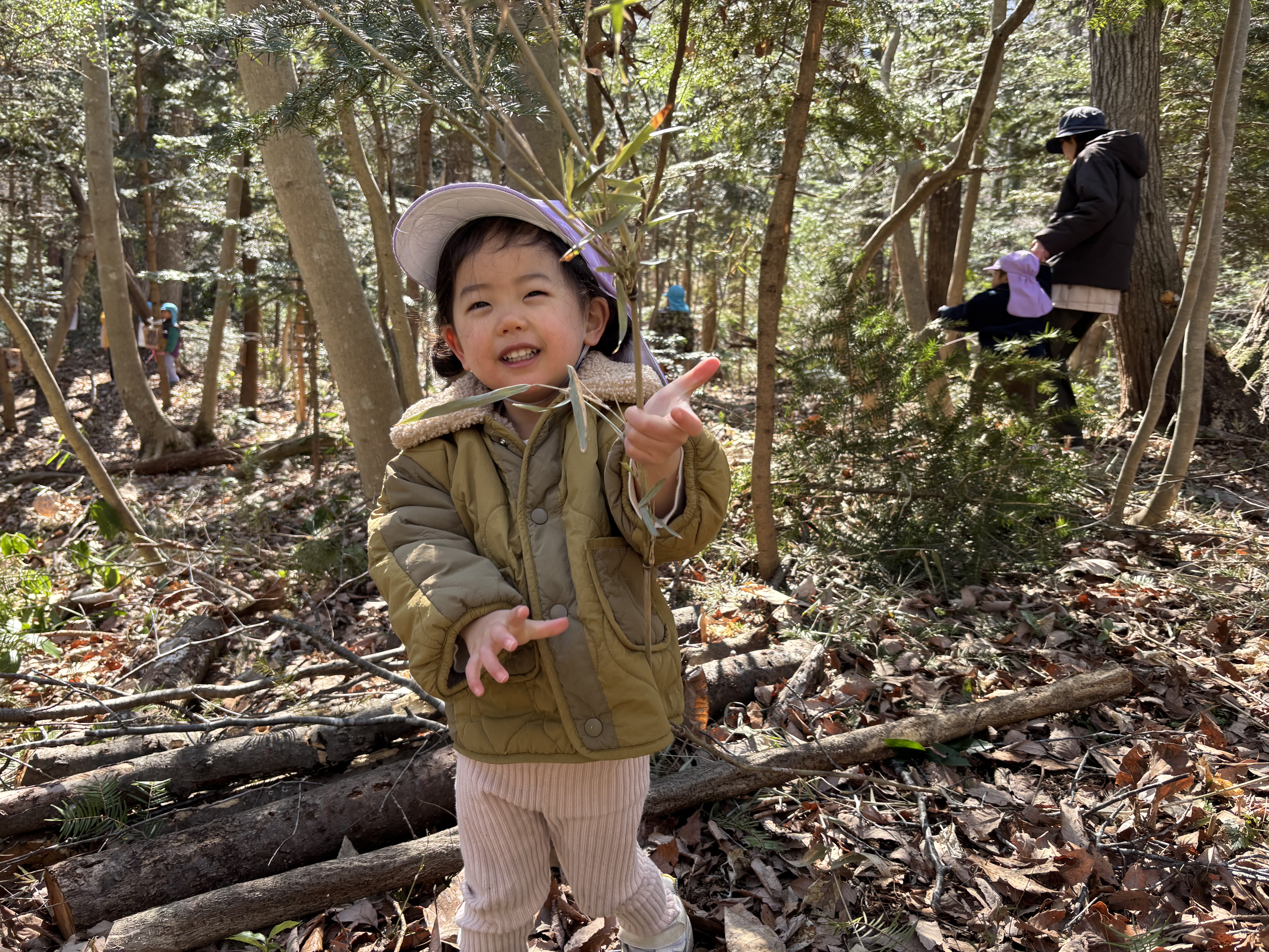 また、日に日に春の日差しが感じられるようになり、森で遊ぶ子どもたちの様子が増えてきたように感んじられます。今日も1歳児ぶどう組の子どもたちが通称「おふろ」と呼ばれている森の窪みで遊んでいましたが、朝、新たに刈り払いしてたところで巨木を見つけたことを教えてあげると、おぼつかない足取りではありますが、自分の足で森の奥まで歩き、この森で何年間も根を張り大きく育った木を眺め、登ってみるなど森を楽しみました。そら組の男児たちは通称「トランポリン」に新たな木を運びぴょんぴょん跳ねていましたが、その下では「ここ僕のお家」と嬉しそうなA君の笑顔が見られました。
