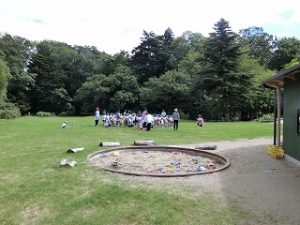 連日雨が降り続き、今日はようやく晴れました。園庭の芝生はまだ濡れていましたが、10時過ぎにもも組を除いた全クラスが集合していました。