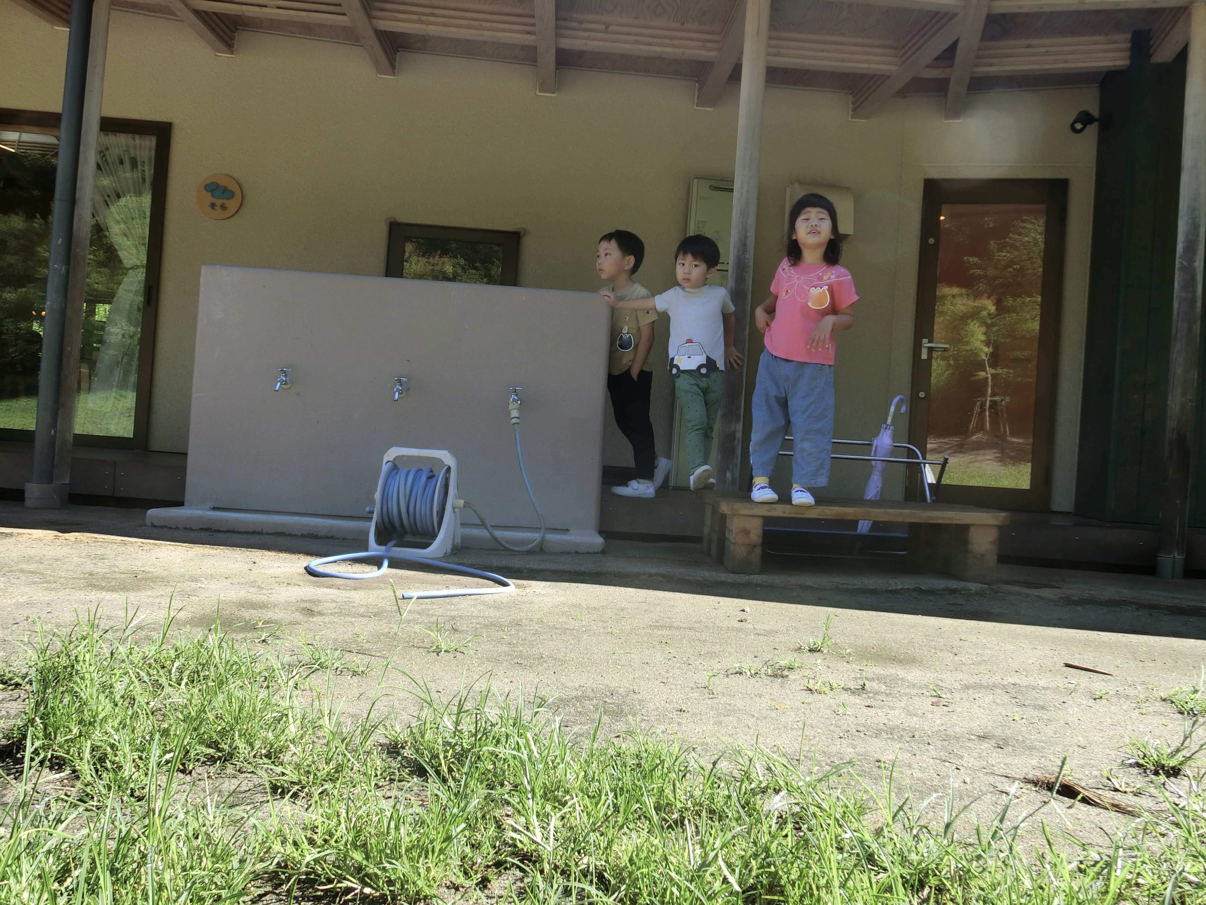 「ねえ、園長先生、どうしてここから煙出てるの?」テラスに並んだ子どもたちが、南園庭の地面が太陽に照らされて湯気となって立ち上る様子に気付いて僕に質問してきます。そこで、「お日さまがお仕事してるんだよ」と返事をしたのですが「・・・?」といった表情・反応が返って来ました。大人には特別ではない出来事・現象が子どもたちにとっては不思議なことであり、それを理解するために知っている言葉で何とか表現しようとする思いがしっかり伝わってきて、今日も朝から色々なことを学んでいるんだんあと思うと嬉しくなります。一方、北園庭では不具合が生じていたスプリンクラーの交換工事が終わり、勢いよく飛び出す水に歓声を上げて水遊びを楽しむ姿が戻って来ました。水を全く怖がらない子どもたちにいたっては、自ら水に向かって行き、スプリンクラーの動きに合わせ動いているのですから可笑しくなります。そうかと思えば、2歳児ぶどう組の子どもたちは蝉の鳴き声に誘われたのか「セミさんどこにいるのかなあ?」そんなことを言いながら森の方から聞こえてくる鳴き声に耳を傾けているので「じゃあ捕まえてきてあげる」と宣言して長靴を履いて森に向かいました。当然のことながら本鳴いているセミを道具なしで捕まえるのは至難の業ですが、実は秘策が・・・。それは、セミが鳴いているということは、抜け殻が間違いなくあるそれを見つけて来るということでした。案の定、森に行くまでもなく今週末に迫ったキャンプに向けて5歳児ひかり組が仕掛けた観察カメラの近くの葉っぱの裏に一つ目の抜け殻を見つけ手の中に隠して持って戻って行くと、先生たちはセミが苦手なのでしょう「本当に見つけた(捕まえた)の?」という表情。そんなみんなの前に手の中から雨で湿った抜け殻を転がしてあげると抜け殻を取り囲み目をまん丸にして観察していました。その後も複数の抜け殻を見つけて空の虫カゴに入れてあげました。そんなことをしているとカマキリの赤ちゃんが登場し、テラスが大混乱になる楽しい一幕もありました。その他にも今日は給食を食べている時間にブラインド(抜き打ち)の避難訓練を行いましたが突然の出来事に驚く姿が見られましたがテーブルの下に潜り込むなど上手に避難していました。今日は地震だけの訓練でしたが、次回は地震後の火災発生も想定してブラインド訓練を計画したいと思います。