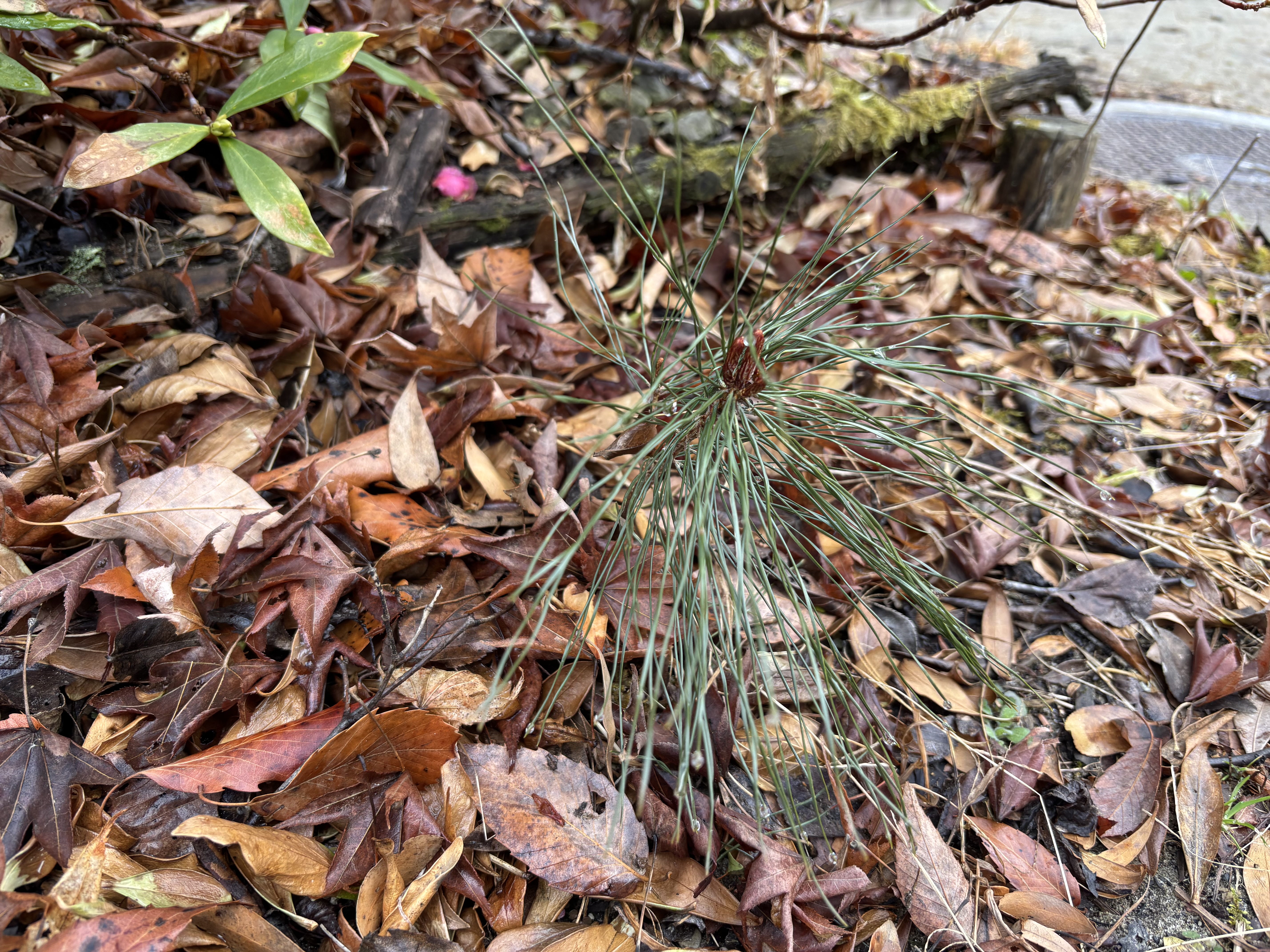 昨夜から朝方まで降ったと思われる雨がカラカラに乾いた地面を少しだけ潤してくれたことで植物たちのホコリが綺麗に流され鮮やかさが戻り小川の水が心無し増えた印象を受けます。また、春の到来を告げながら香りを振りまいてくれる沈丁花(じんちょうげ)の蕾が喜んでいるように感じます。その足元には学内の松の子どもと思われる松の幼木(赤ちゃん松)が「ここにいるよ。気づいて」と言わんばかりに背伸びをするかのように育っていました。森(学内)の松が次々に松食い虫の影響で枯れてしまっているので、この赤ちゃん松が枯れることなく大きく育ってくれることを願うものです。