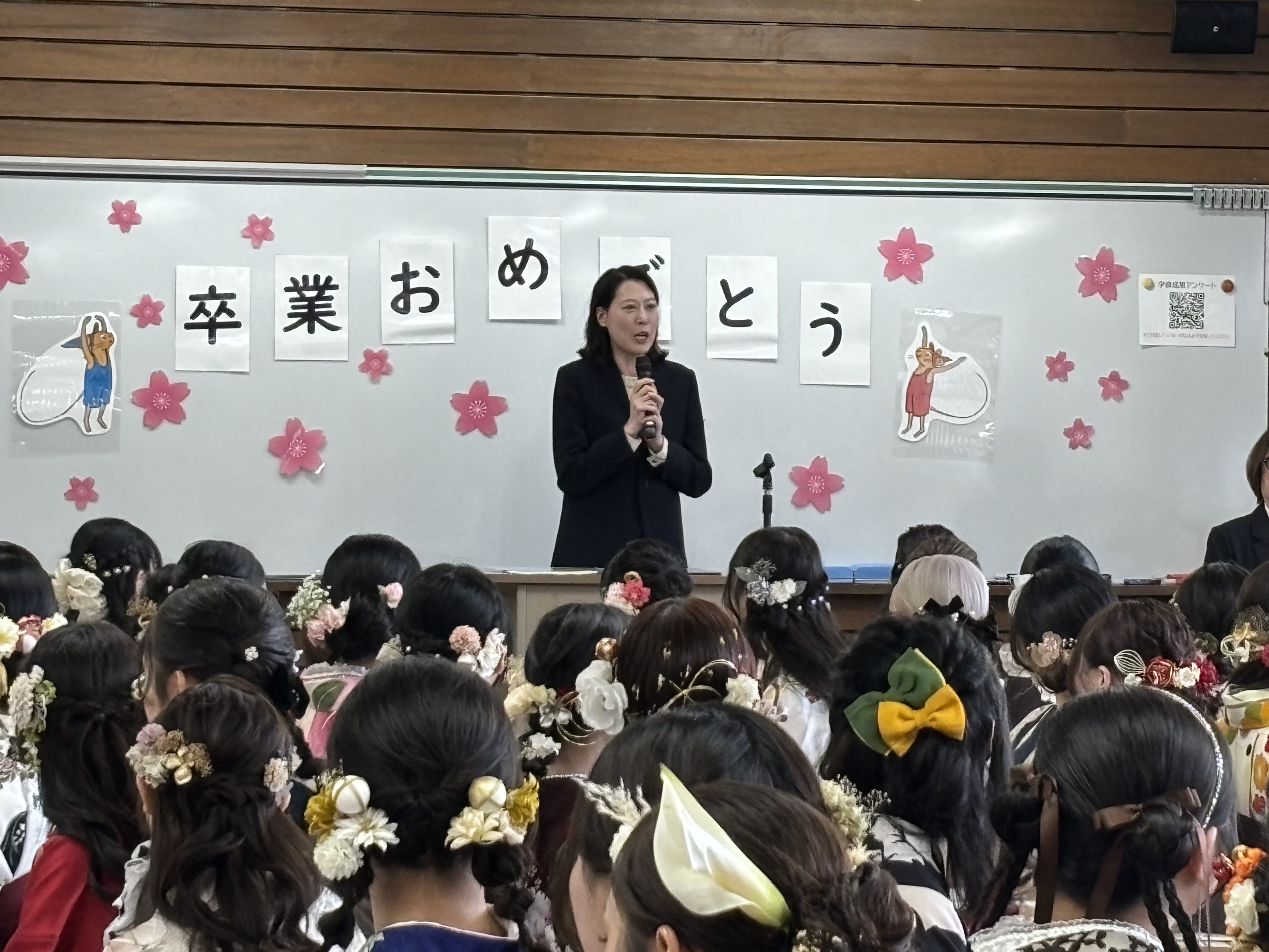 一方、天気が心配だった大学・大学院の学位記授与式が行われた学内には色鮮やかな袴姿の学生たちが溢れ、あちこちで記念撮影をする姿が見られました。授与式には参加しませんでしたが、式終了後に教室に戻ってきた学生たちに、専攻の先生たちと同じようにお祝いのメッセージを伝えることができました。期待と不安、寂しさを抱えて巣立っていく学生たちの前途が悠々であるよう祈ります。卒業おめでとう。