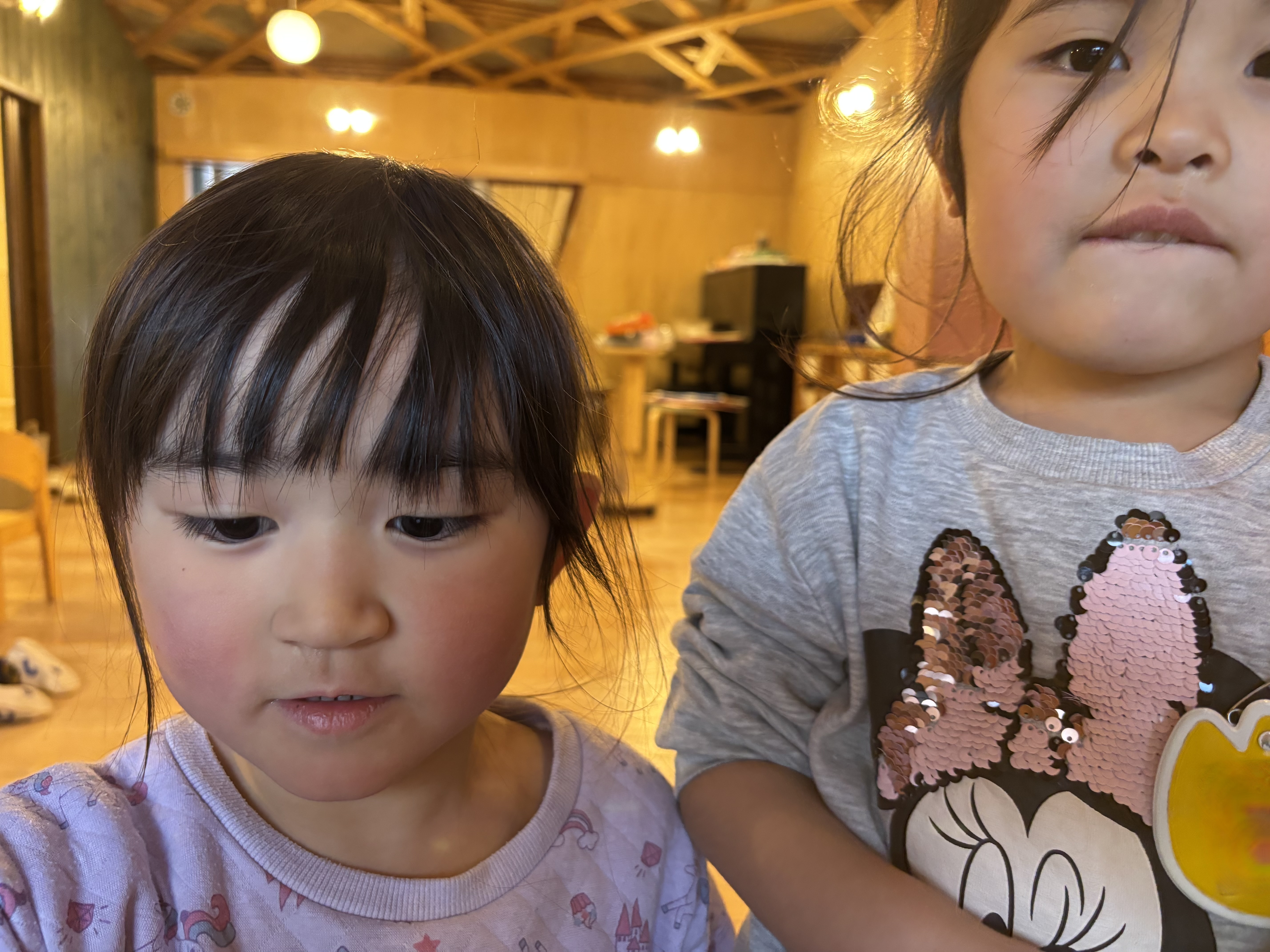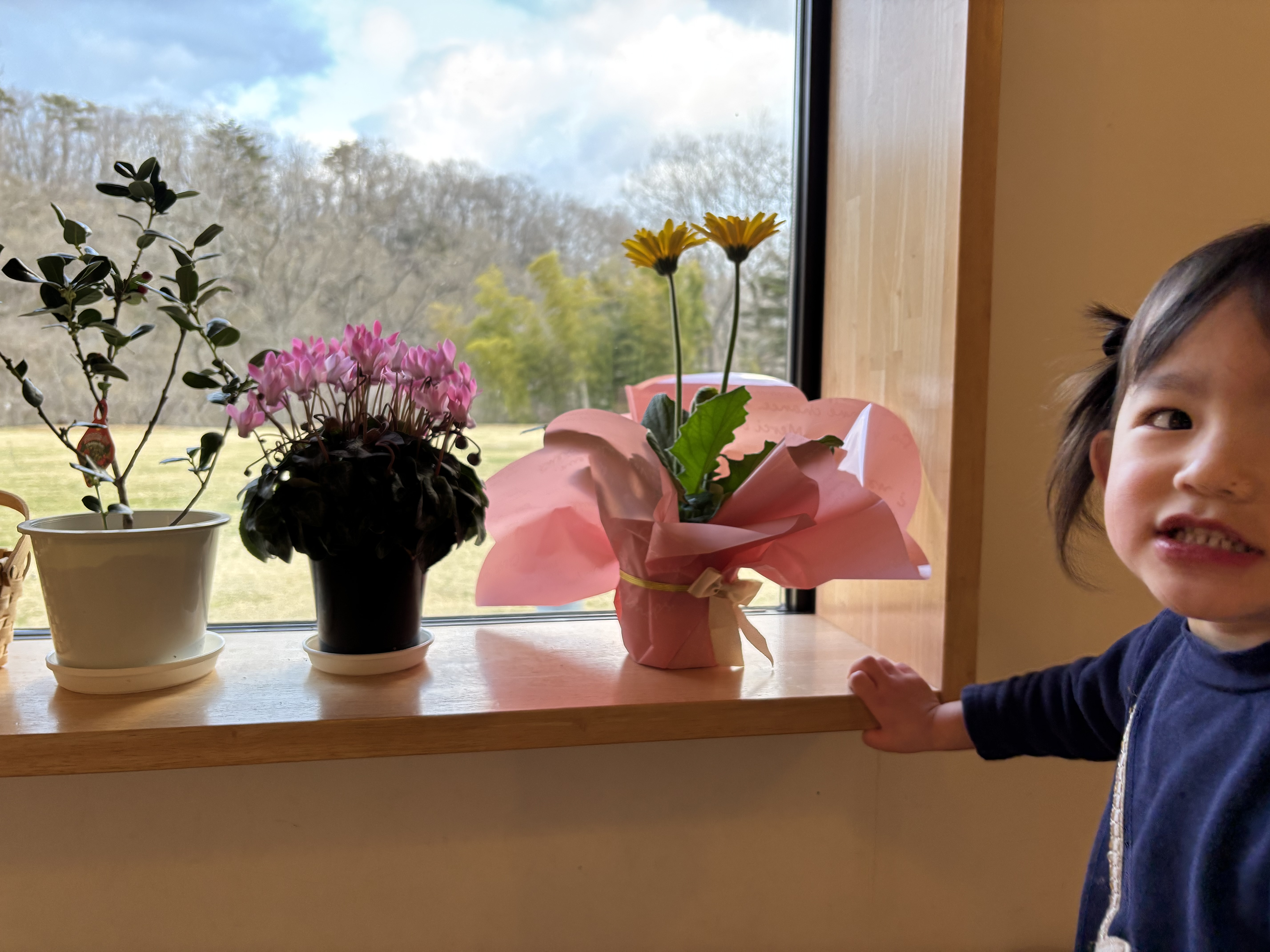 日に日に日が長くなっていることを実感しています。それでもある程度時間を決めて外遊びを終えて保育室で過ごすようにしています。そんな時間帯に1歳児ぶどう組のAちゃんと以上児の遊んでいる様子を見ながら園舎内を散歩したところ廊下の出窓のところに飾ってある花を眺めて指を指し「黄色いお花」とニコニコしていました。その数分前までは涙を流していたことなど微塵も感じさせることはありませんでした。