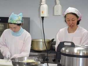 今日は「よつばランチ」でした。2人のお母様が朝から給食室に入って、栄養士の先生の指導の下に早速野菜を切っていました。さすがに手際がよく着々と給食が出来上がっていました。