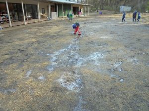 にじ組はお集まりの真っ最中、そら組みはお集まり後にチョッと好きな遊びをして学内に散歩に行く予定にしていました。昨日泥んこだった南園庭は水溜りが凍っていました。それをひかり組の男の子達が足でつぶしながら、音と氷を壊す感覚を楽しみながら、水溜りに出来た氷を次々壊していました。。