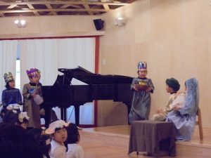 3人の博士は宝物を持って救い主の誕生をお祝いします。最後にみんなが揃って「♪グローリア」の歌を歌い、「♪初めてのクリスマス」を歌いました。1グループは練習でなかなか大きな声が出せずに苦労したグループです。