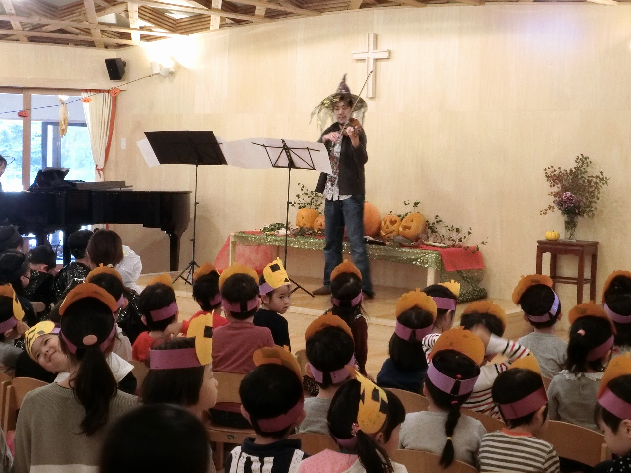 さあ、これからハロウィンコンサートが始まります。ヴァイオリニストの佐久間さんを呼びましょう!「さ・く・ま さ~ん」