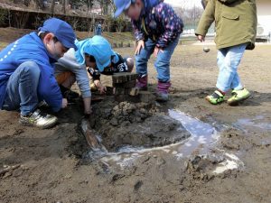「フキノトウを見つけたいの!見つけなかった?」と近くにいたひかり組に尋ねると、「もりのちかくにあるよ。」「南園庭の斜面で見つけたいの。ないかな?」「う~ん」女の子は目を凝らして「あった!!」私が気が付かなかった場所で見つけてくれました。1個見つかると次々見つかります。