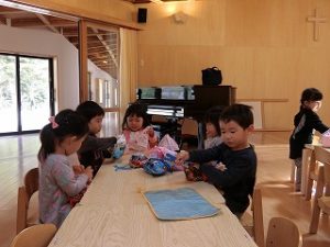 みんなの広場ではにじ組やそら組の給食準備が始まっていました。テーブルの上にランチョンマットを敷いておはしを出していました。今日はお弁当の人達もいます。それぞれの給食準備が始まっていました。