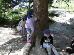 園庭で遊んでいたぶどう組とりんご組も危険のない場所でシェイクアウト。ひかり組さんは朝の集まりで絵本を読んでいました。
