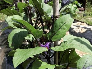 朝は涼しいかな?と思いましたが、次第に気温が上がり、日向は結構暑くなりました。「えんちょうせんせい、てんとうむし」「どこどこ」子ども達が教えてくれたところを見たら可愛いテントウムシが葉っぱにしがみついていました。ナスも花をつけ始めました。