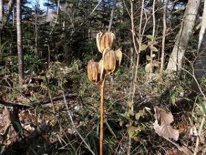 紅葉した葉が降るように落ち、森の道を埋め尽くしています。森は見通しが良くなり奥まで見渡せるようになりました。